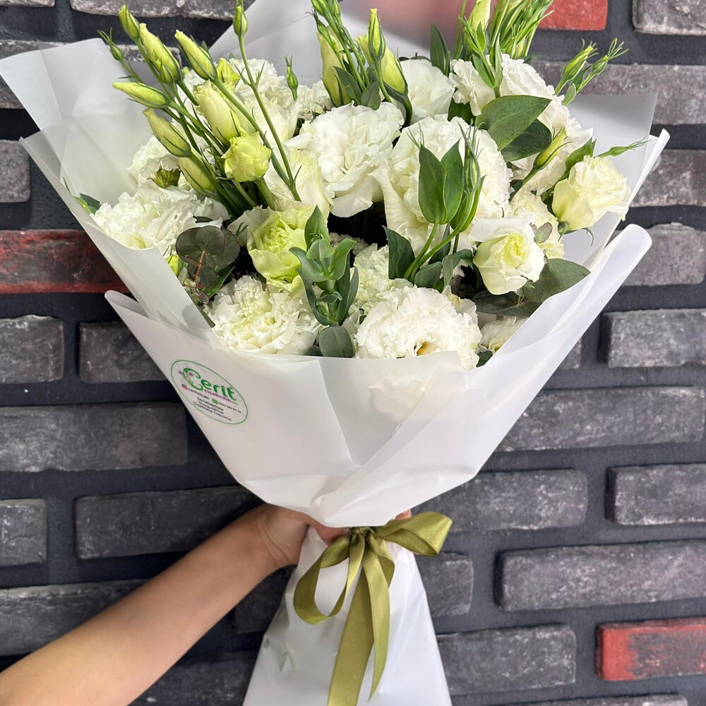 Bu zarif buket, 11 adet saf beyaz lisyantus ve 2 dal taze okaliptus dalı birleştirecek şekilde özenle tasarlanmıştır. Bu muhteşem çiçek aranjmanı, doğal güzelliği ve sofistike şıklığı ile her türlü özel günü daha da unutulmaz kılacaktır.
