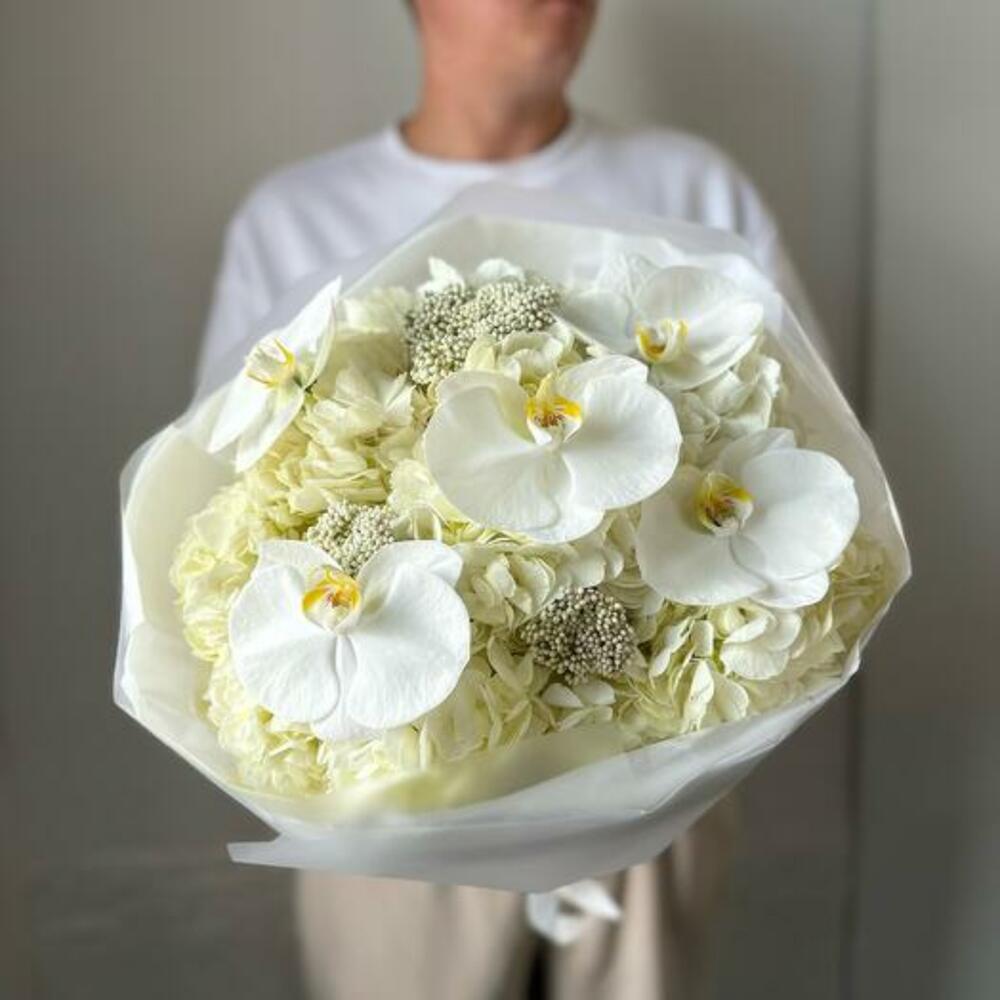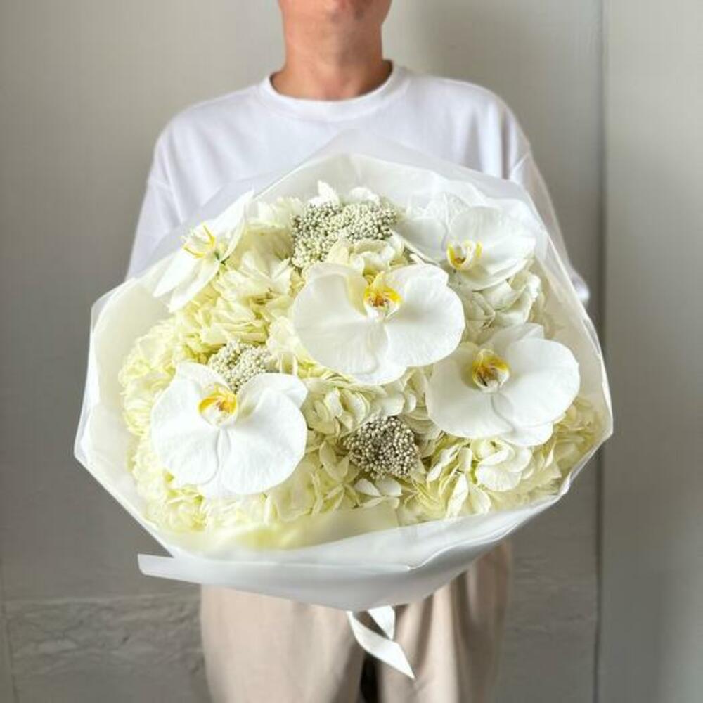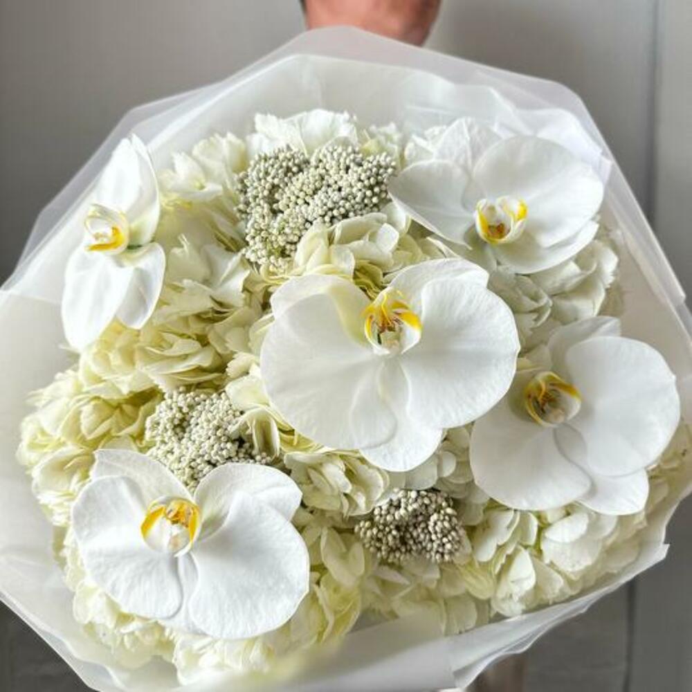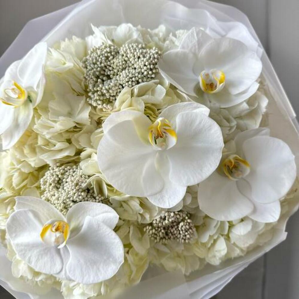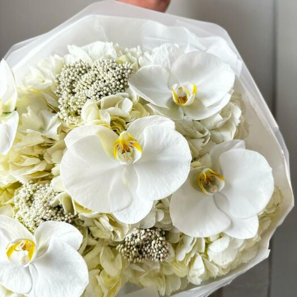 Bu buketin dingin zarafetini kucaklayın. Bu çarpıcı aranjman, saf beyaz ortancanın zamansız güzelliğini, orkidelerin narin cazibesini ve ozothamnusun yumuşak dokusunu sergiliyor. Bu enfes çiçeklerin uyumlu karışımı, zarafet ve sofistike bir buket yaratıyor. Düğünler, yıldönümleri veya zarif bir teşekkür jesti için mükemmel olan bu beyaz buket, şık ve minimalist bir ambalajla paketlenerek her durum için unutulmaz bir hediye haline getirilmiştir.