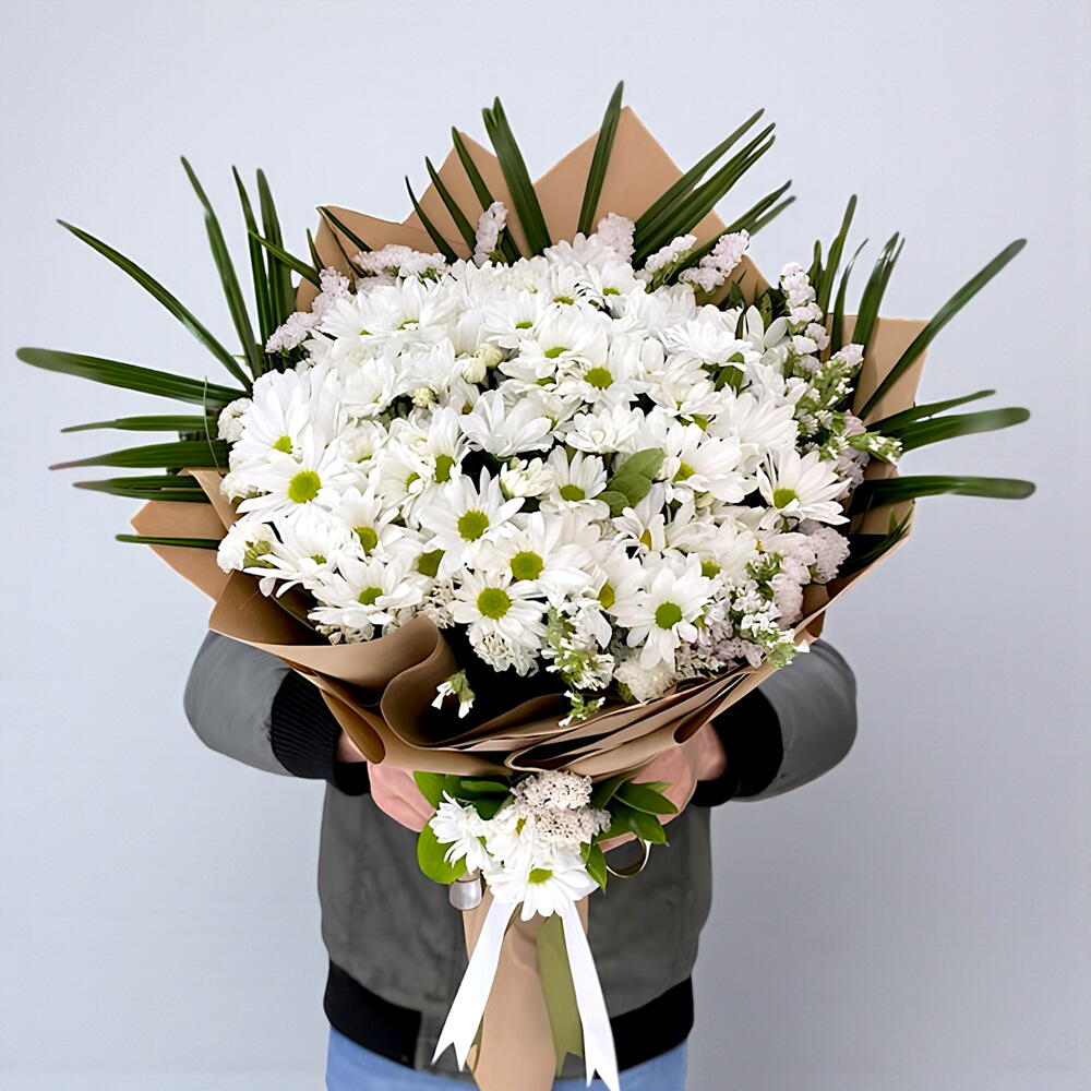 Bu büyüleyici çiçek buketi, 10 adet saf beyaz ithal papatya ve 3 adet zarif fonex yaprağı ile hazırlanmıştır. Bu kompozisyon, doğanın tazeliğini ve güzelliğini evinize veya ofisinize taşıyacak. Her bir detayı özenle düşünülen bu buket, sevdiklerinizin yüzünde kesinlikle bir gülümseme yaratacaktır.