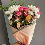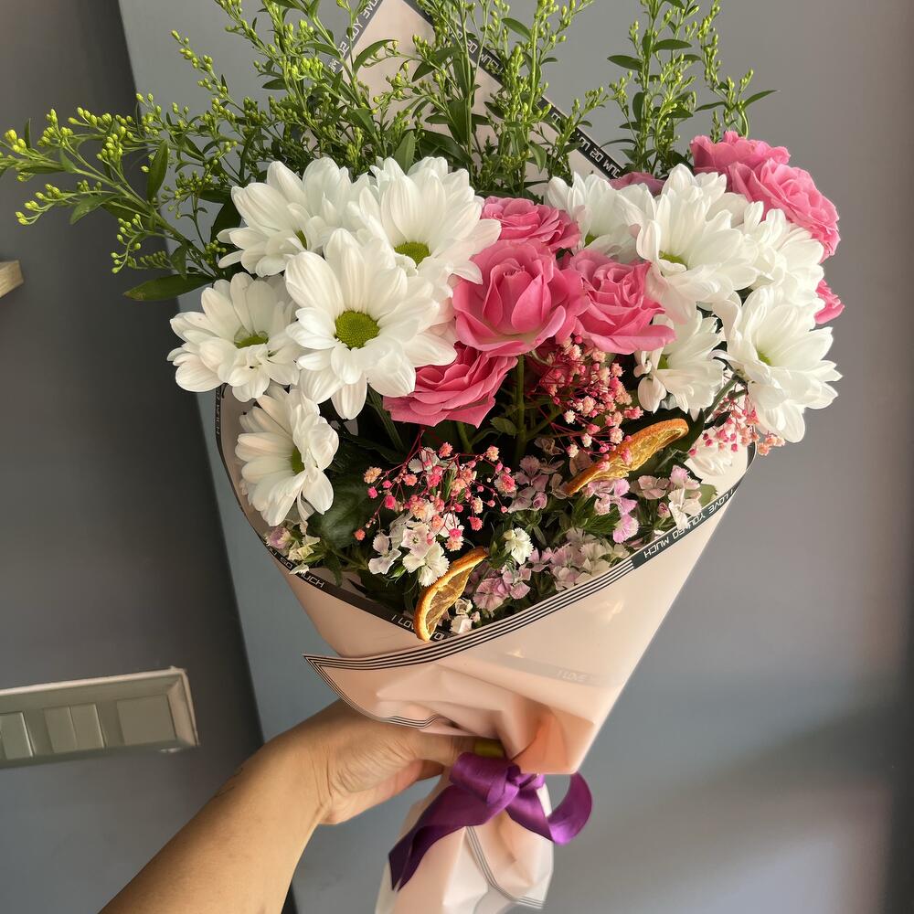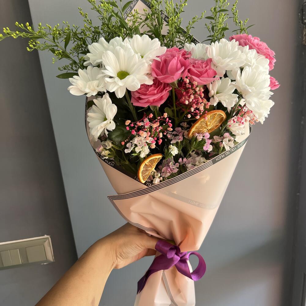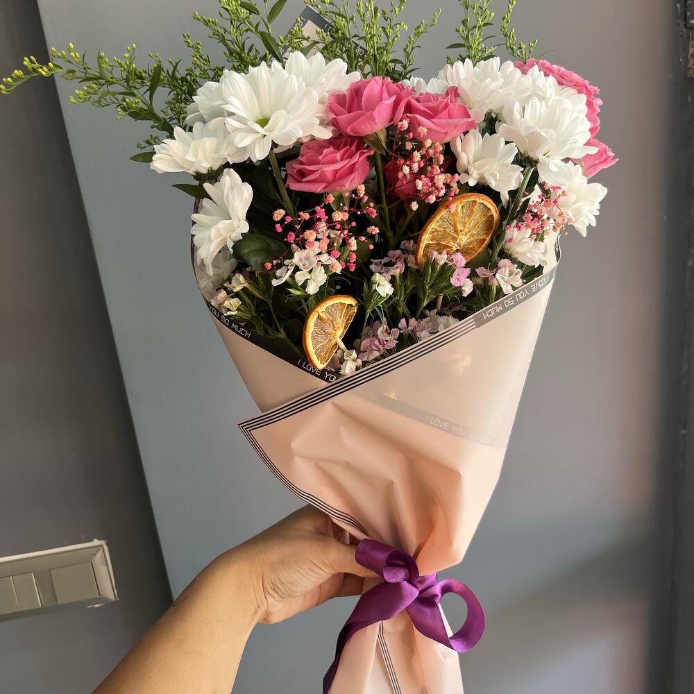 Bu çarpıcı Karışık Buket, 15 adet nazik beyaz papatya, 2 adet soli, canlı pembe renkte 8 adet çardak gül, çarpıcı bir kontrast yaratan 2 adet kuru limon, 4 adet pembe cipso ve 8 adet zarif pembe hüsnü yusuf çiçeği ile özenle hazırlanmıştır. Bu renkli ve neşeli buket, sevdiklerinize ne kadar önem verdiğinizi göstermenin en güzel yolu olacaktır.