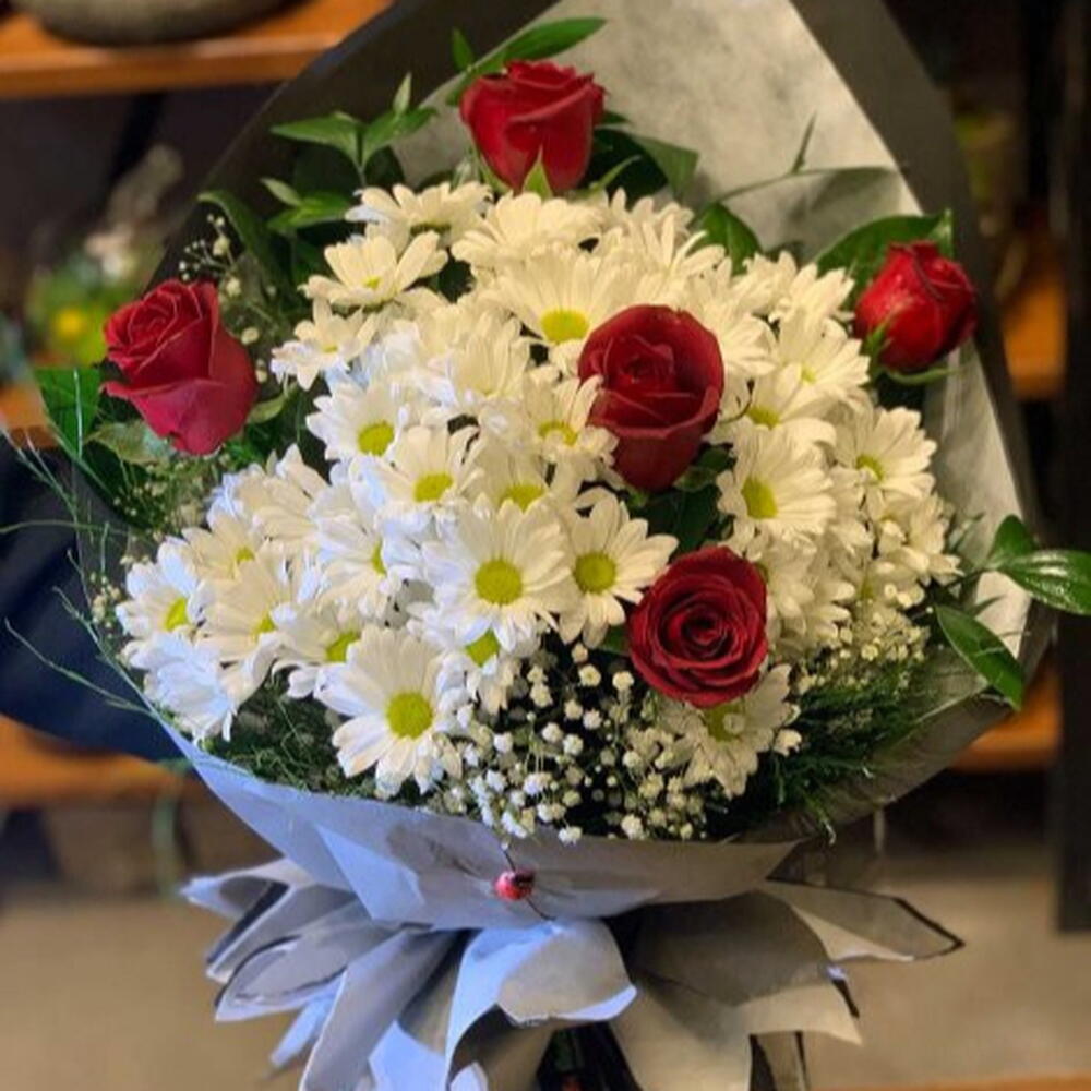 kırmızı gül - 5 adet beyaz papatya - 10 adet yeşillik - 8 adet cipso - 8 adet