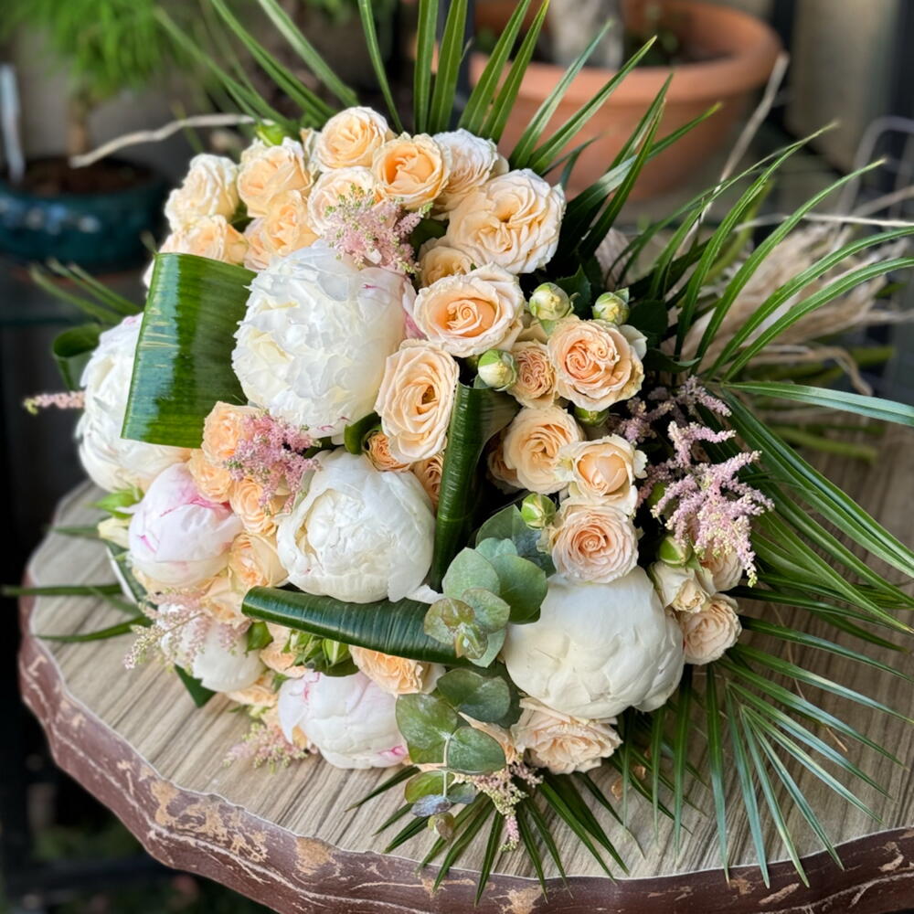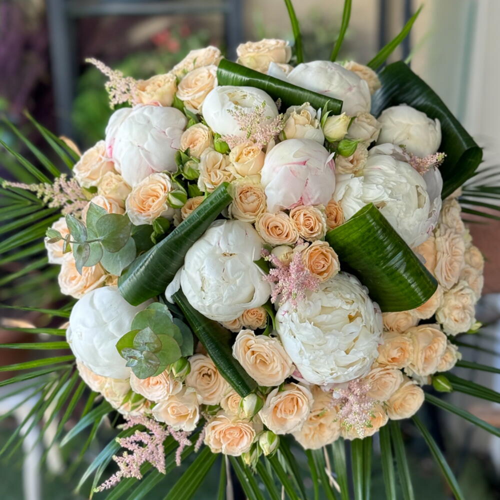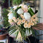 Zamansız Asalet – Beyaz Şakayık Somon Gül Buketi Doğanın en zarif dokunuşlarını bir araya getiren bu gösterişli buket; beyaz şakayıkların saflığı, somon çardak güllerin sıcaklığı ve tropik yeşilliklerin doğallığıyla büyüleyici bir uyum sunuyor. Her detayı özenle hazırlanmış bu aranjman, hem klasik hem modern dokunuşları bir arada barındırıyor. 9 adet beyaz şakayık Somon tonlarında bol çardak gül Egzotik palmiye yaprakları ve yeşil dokunuşlarla tamamlanmış İster bir kutlama, ister anlamlı bir sürpriz için… Zamansız Asalet, duygularınızı en şık şekilde ifade etmenin yolu.
