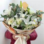 Saflığı, zarafeti ve huzuru temsil eden beyaz çiçeklerin bir araya geldiği bu özel buket; beyaz lilyumlar, gerberalar, güller ve gipsofila çiçeklerinin muhteşem uyumunu okaliptüs yapraklarının doğal havasıyla tamamlıyor. İster sevdiklerinize zarif bir jest yapmak için, ister özel günleri daha anlamlı hale getirmek için tercih edin, Beyaz Sevgi Buketi her zaman kalplere dokunur. Romantik bir yıldönümü hediyesi, doğum günü kutlaması ya da sadece “seni düşünüyorum” demek için mükemmel bir seçenektir. Bakım Önerisi: Çiçeklerin taze kalması için vazonun suyunu her gün değiştirin ve serin bir ortamda muhafaza edin. Direkt güneş ışığından uzak tutmanız önerilir.