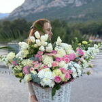 Bu muhteşem sepet çiçek düzenlemesi, 15 adet beyaz eustoma, 9 adet krizantem, 5 adet fenix yaprağı, 6 adet şebboy, 9 adet pembe gül, 11 adet pembe kustova roz ve 21 adet tülpan ile titizlikle hazırlanmıştır. 6 adet ofkaliptusun eklenmesi, bu çiçek aranjmanını tamamlayarak, doğal ve taze bir görüntü kazandırır. Bu seçkin çiçek sepeti, zarif ve sofistike bir sunum için idealdir. Geniş renk yelpazesi ve çeşitli çiçek türleri ile, bu güzel sepet çiçek düzenlemesi her ortama canlılık ve stil katacaktır.