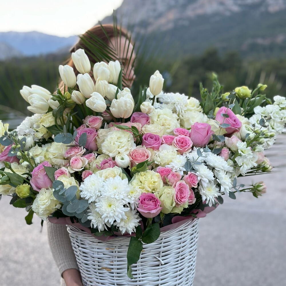 Bu muhteşem sepet çiçek düzenlemesi, 15 adet beyaz eustoma, 9 adet krizantem, 5 adet fenix yaprağı, 6 adet şebboy, 9 adet pembe gül, 11 adet pembe kustova roz ve 21 adet tülpan ile titizlikle hazırlanmıştır. 6 adet ofkaliptusun eklenmesi, bu çiçek aranjmanını tamamlayarak, doğal ve taze bir görüntü kazandırır. Bu seçkin çiçek sepeti, zarif ve sofistike bir sunum için idealdir. Geniş renk yelpazesi ve çeşitli çiçek türleri ile, bu güzel sepet çiçek düzenlemesi her ortama canlılık ve stil katacaktır.
