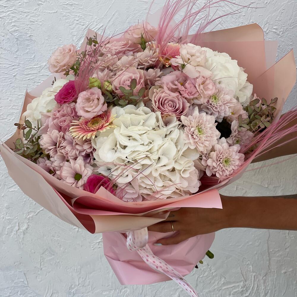 Eustoma - 3 adet Eucalyptus - 3 adet Hydrangea - 3 adet Gerbera - 5 adet rose - 3 adet