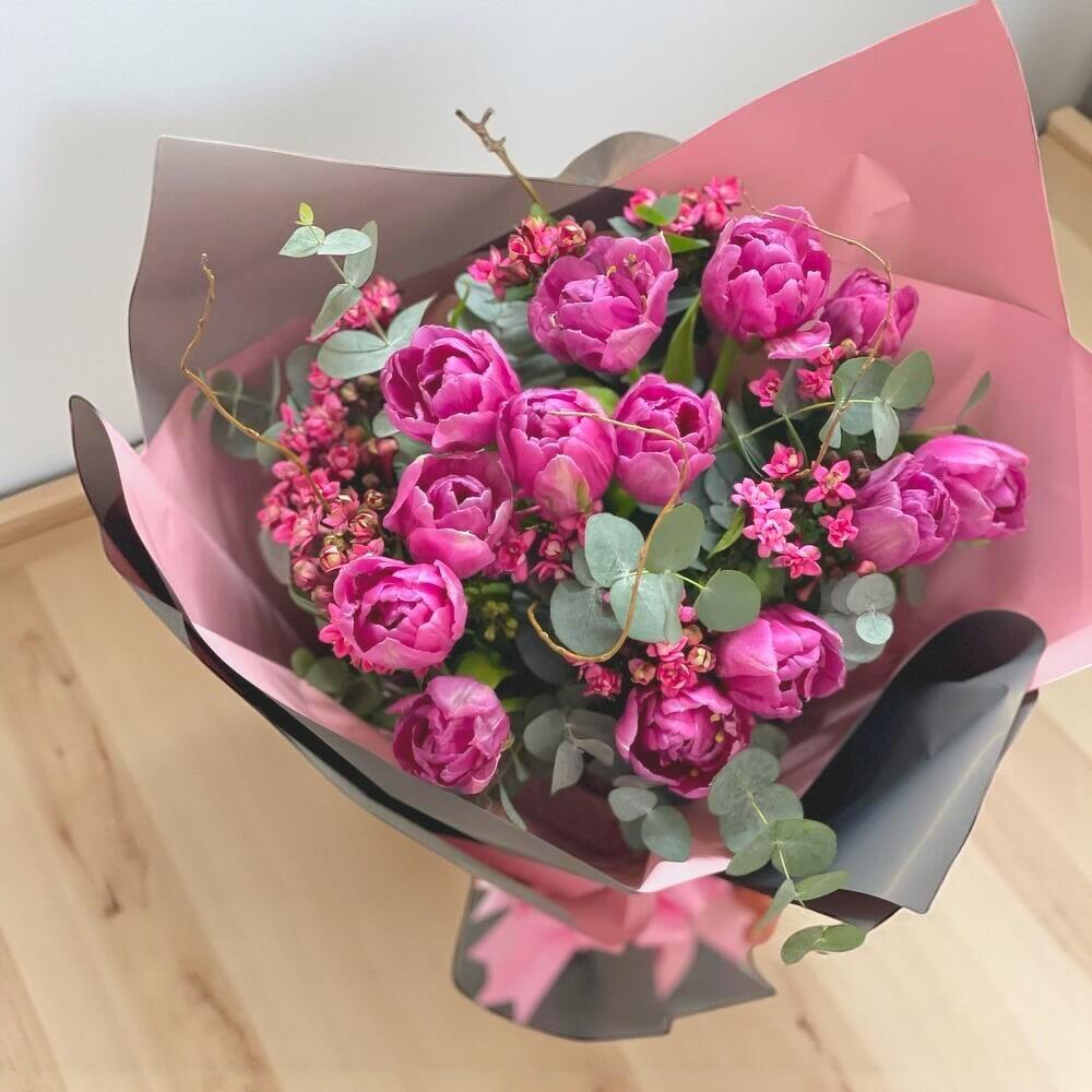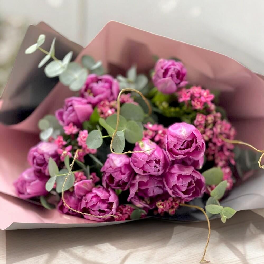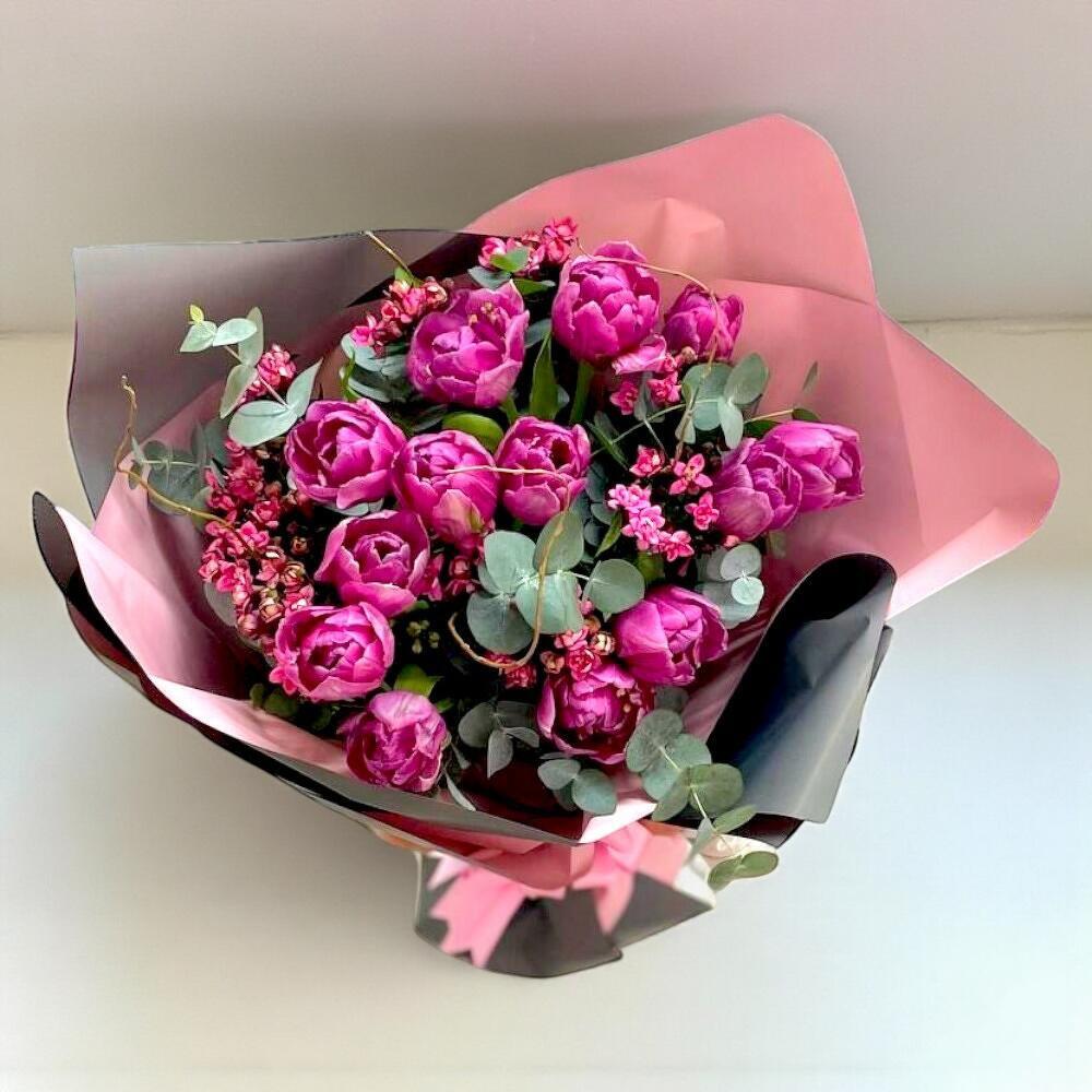 pink tulips - 25 adet okaliptüs - 15 adet ambalaj mat filmi - 7 adet
