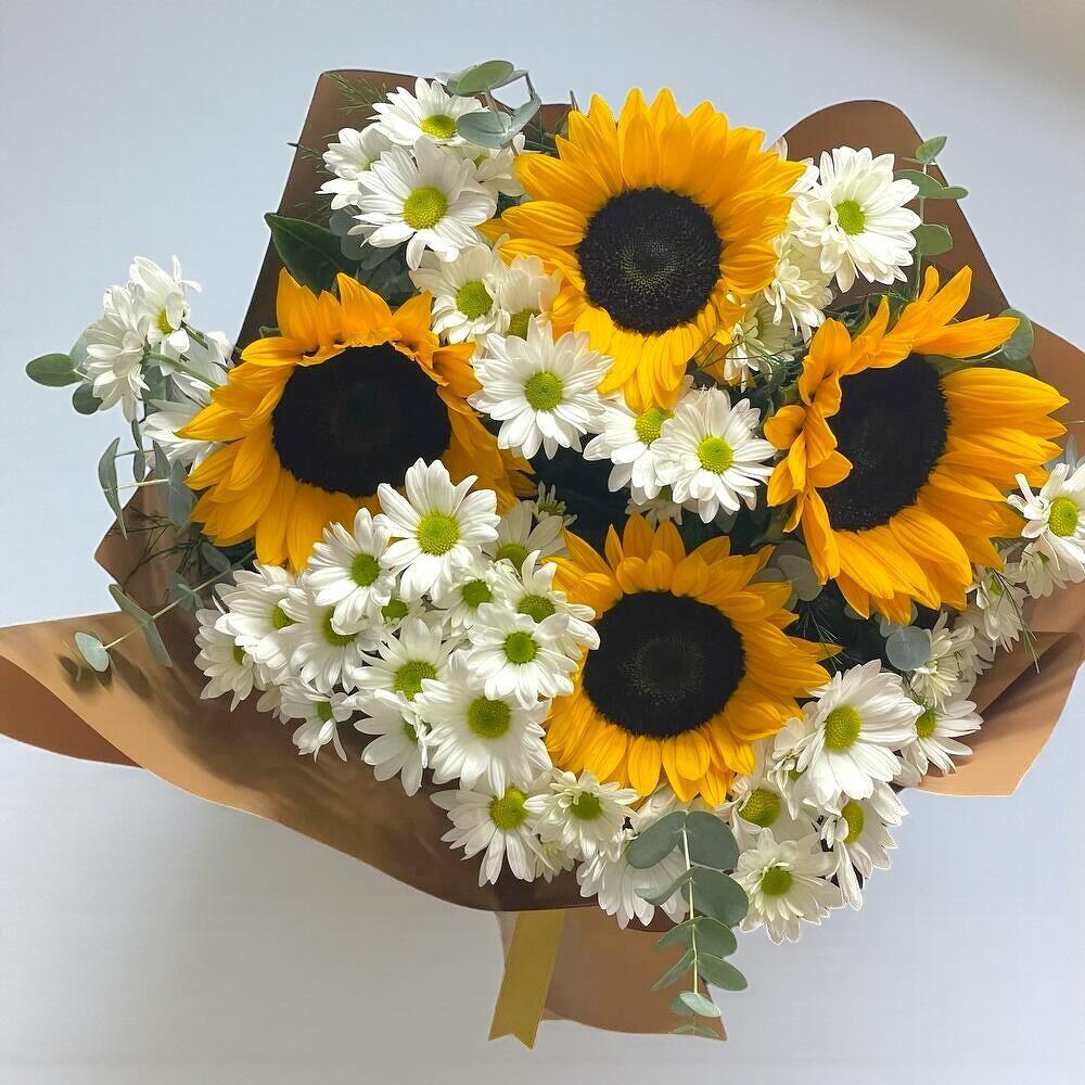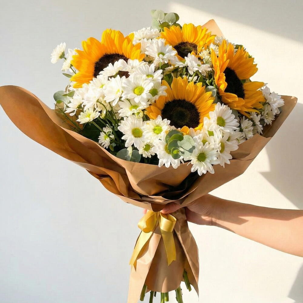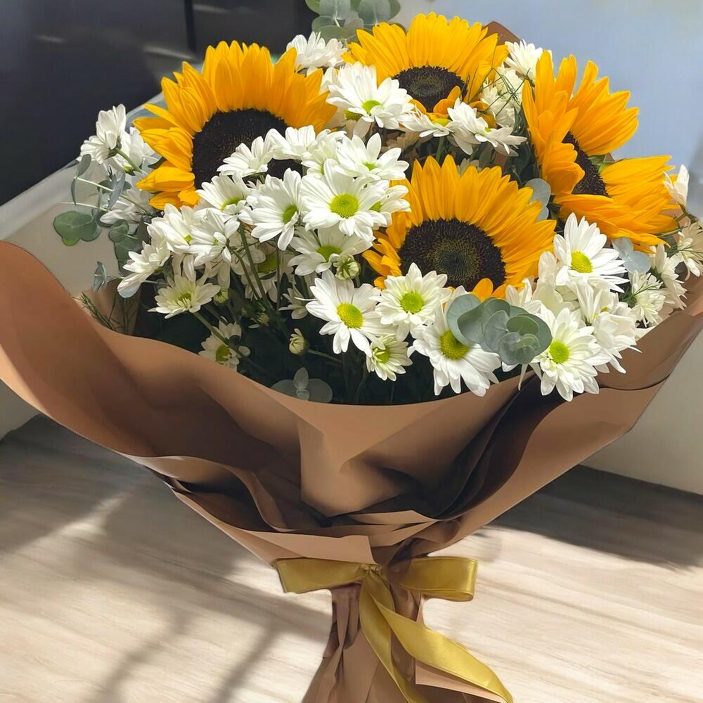 Bu harika buket, baharın canlılığını ve enerjisini evinize taşır. Sarı güneş çiçekleri ve beyaz papatyaların eşsiz uyumu, okaliptüs yapraklarının yeşil dokunuşlarıyla tamamlanıyor. Zarif ambalajıyla sevdiklerinizi mutlu etmek veya evinize renk katmak için mükemmel bir seçimdir. Bakım Önerileri: Buketinizi serin ve güneş görmeyen bir yerde muhafaza ediniz. Her gün suyu değiştirerek çiçeklerin uzun süre canlı kalmasını sağlayabilirsiniz. Buketin saplarını çapraz şekilde keserek daha iyi su çekmesini sağlayabilirsiniz.