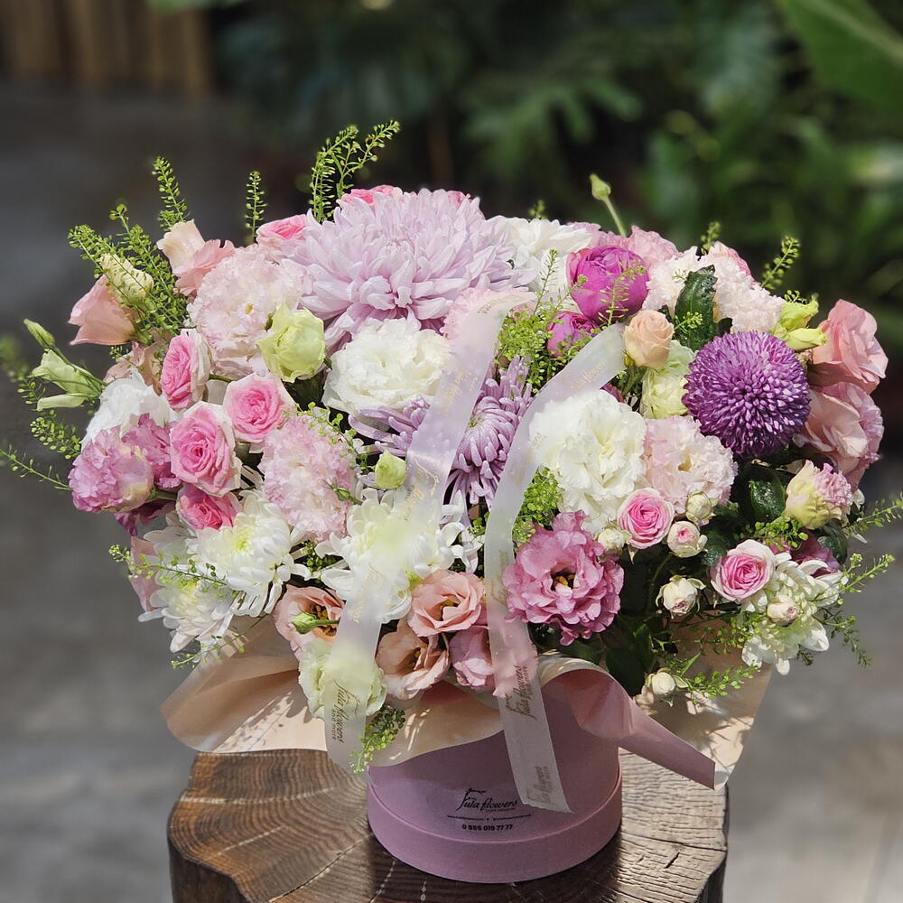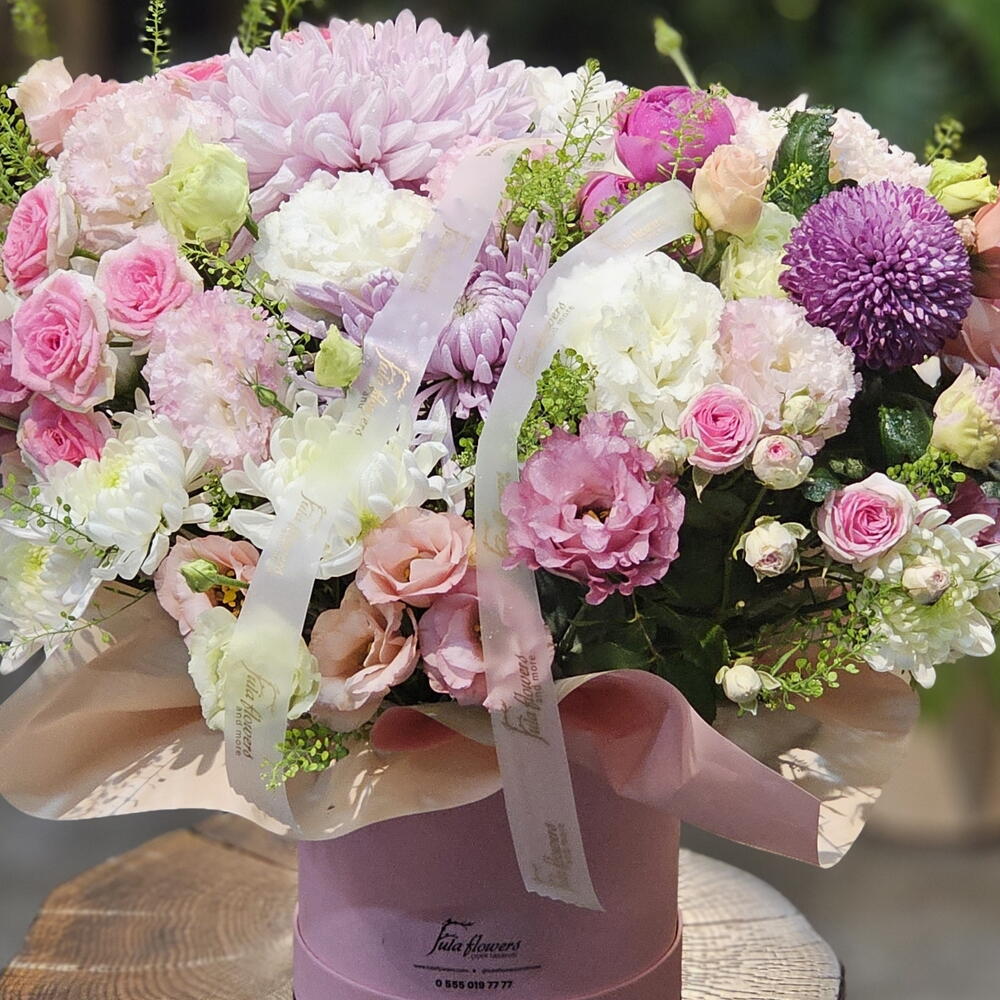 Bu muhteşem kutuda çiçekler, 4 adet zarif Anastasya, 5 adet pembe sprey gül, 3 adet beyaz krisantem ve 5er adet beyaz ve pembe lisianthus içermektedir. Modern ve şık bir hediye ile sevdiklerinizi mutlu edin. Bu çiçeklerin her biri özenle seçilmiş ve mükemmel bir kompozisyon yaratmak için bir araya getirilmiştir. Bu çarpıcı çiçek kutusu ile herhangi bir odaya canlılık verin.