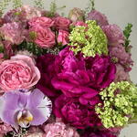 Bu zarif çiçek aranjmanı, pastel pembelerin, krem beyazların ve zengin yeşillik dokunuşlarının yumuşak bir paletini bir araya getiriyor; hepsi sofistike bir açık mavi kadife kutuda sunuluyor. Nazik güller, kabarık ortancalar ve fırfırlı karanfillerin yer aldığı buket, romantizm ve incelik yayıyor. Çiçeklerin çeşitli dokuları ve nazik tonları uyumlu bir bütün oluşturuyor ve bu da onu güzellik ve zerafet gerektiren her durum için mükemmel kılıyor.