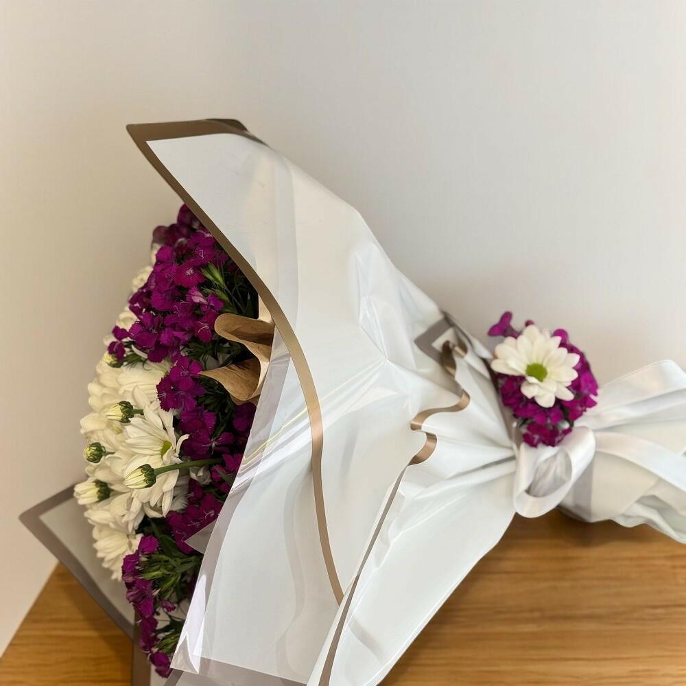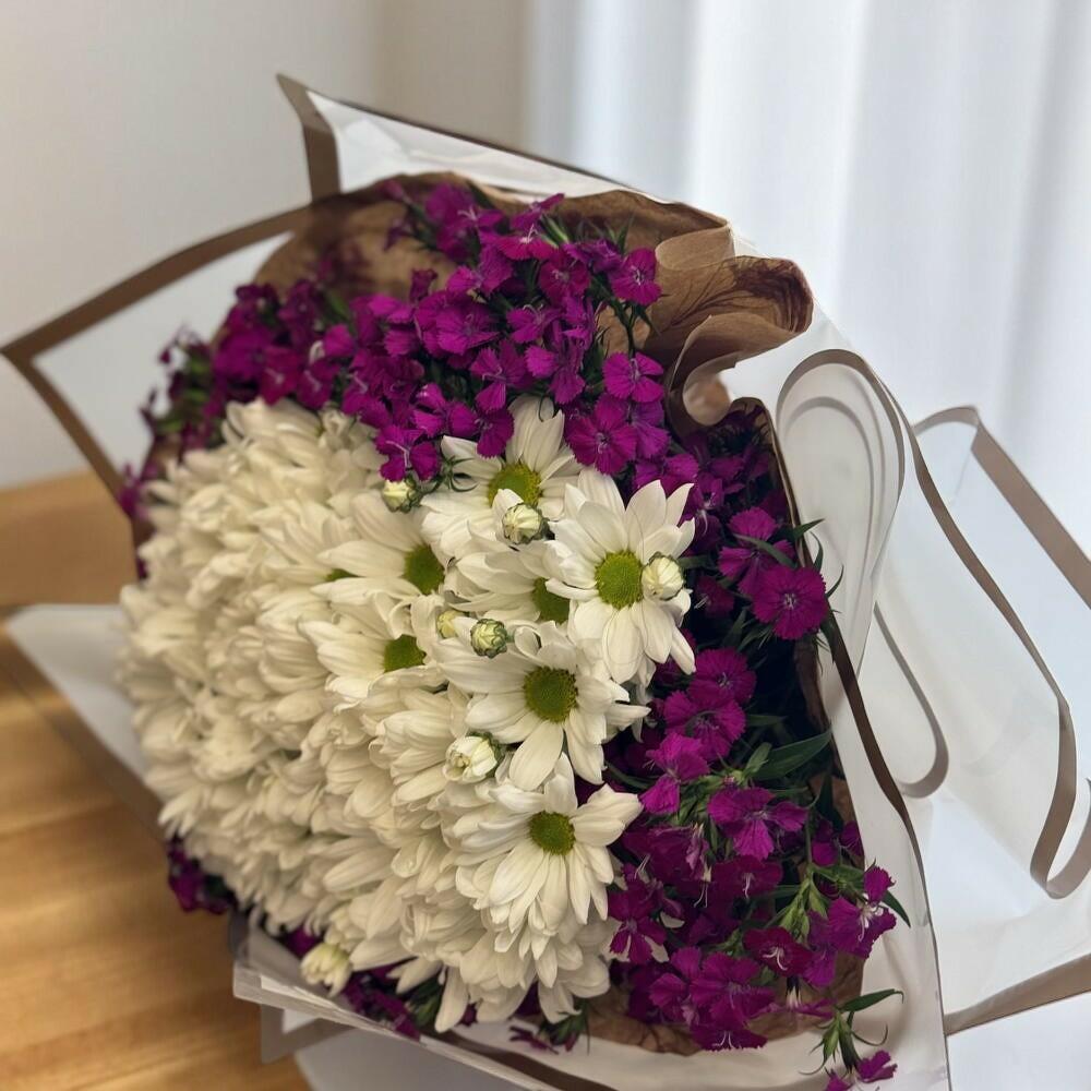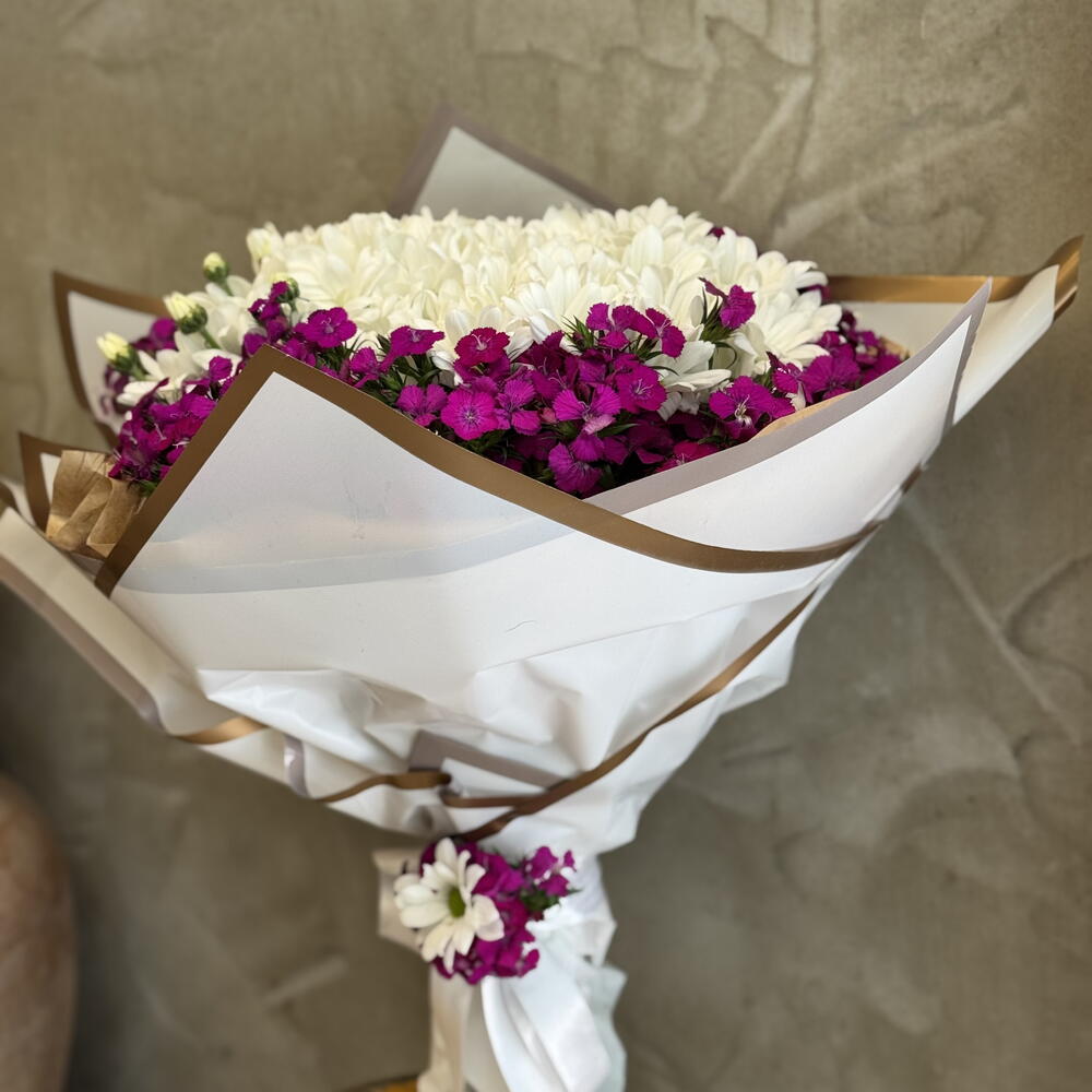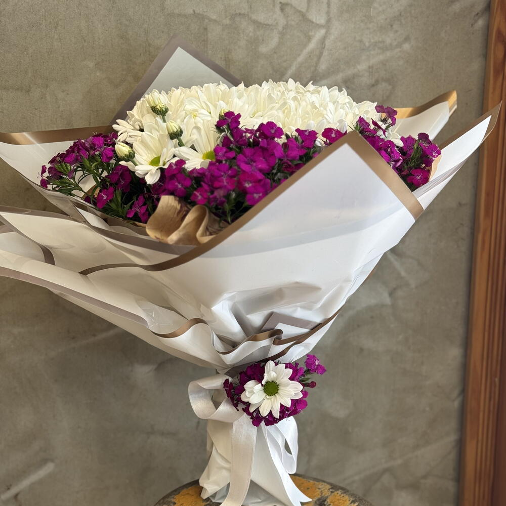 Canlı renklerin ve zarafetin kusursuz uyumunu yansıtan bu buket, sevdiklerinize neşe ve samimiyet dolu bir jest yapmak için mükemmel bir seçimdir. Beyaz papatyaların saflığı, mor pembe tonlarındaki minik çiçeklerin enerjisiyle buluşarak hem göz kamaştırıcı hem de iç ısıtan bir görünüm sunuyor. Sade ama etkileyici bir tasarıma sahip olan bu buket, doğallığı sevenler için özel olarak hazırlandı. Doğum günü, teşekkür ya da sadece gülümsetmek için ideal! Buketi serin bir ortamda muhafaza edin, doğrudan güneş ışığından koruyun. Vazonun suyunu her gün tazeleyin ve sapları çapraz şekilde keserek suyu daha iyi emmelerini sağlayın. Bu şekilde buketinizin ömrünü uzatabilirsiniz.