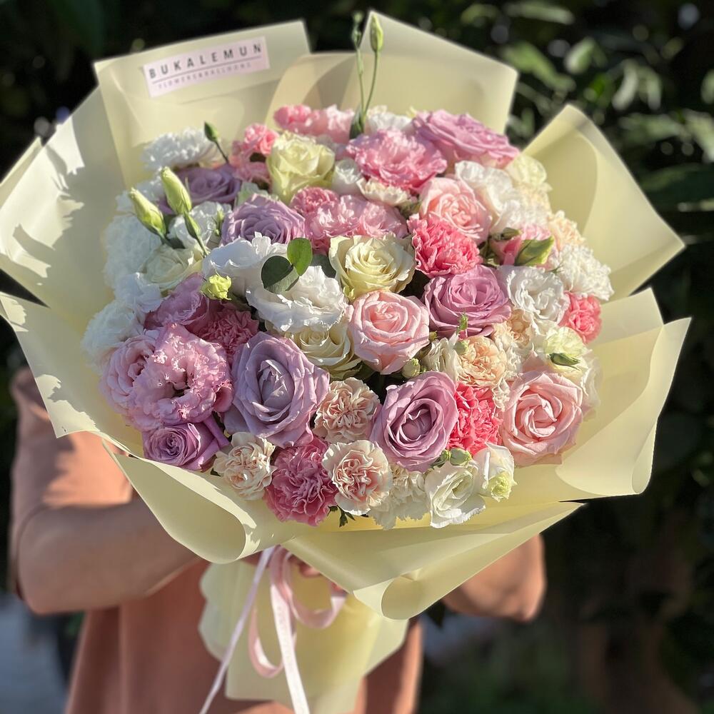 Eustoma - 15 adet rose - 9 adet dianthus - 13 adet dianthus spray - 5 adet