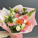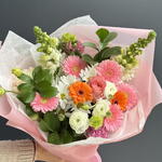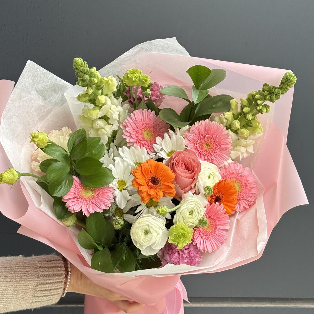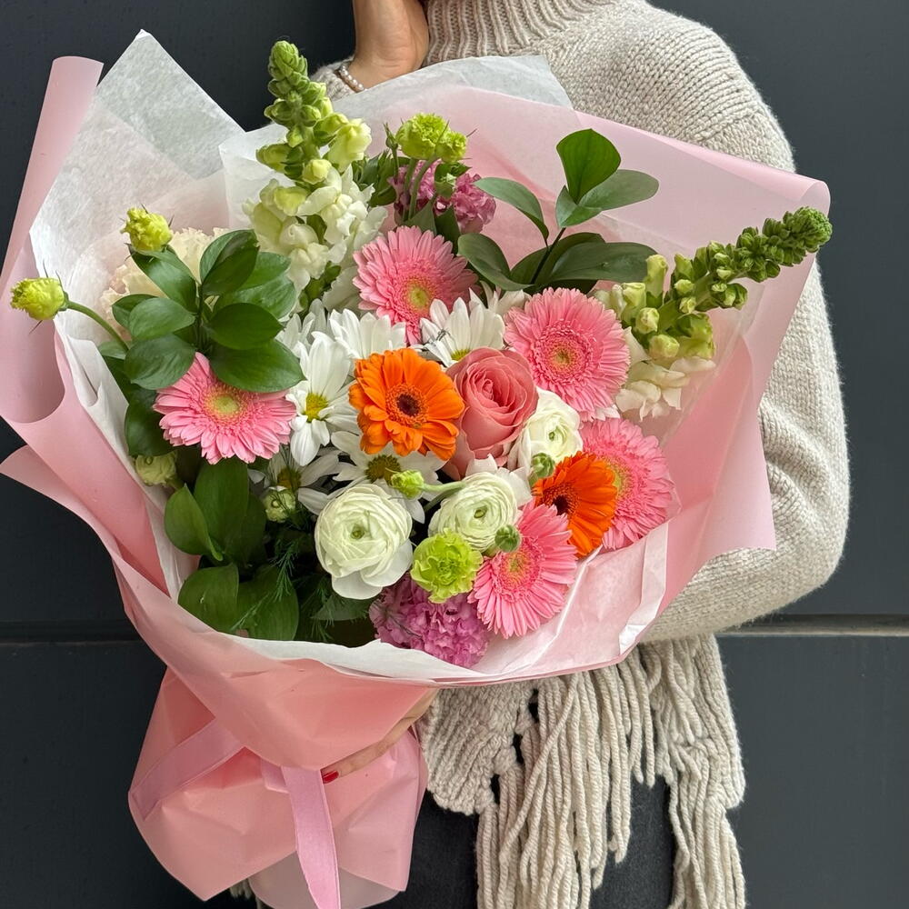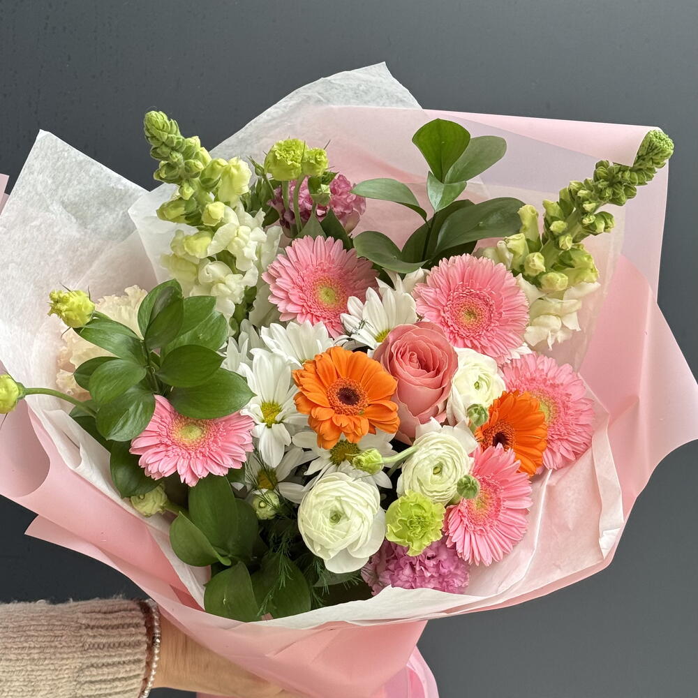 Хороший букетик, необычный, самый недорогой с розами. Внизу, вроде как, флористическая губка. Доставка отлично в срок.