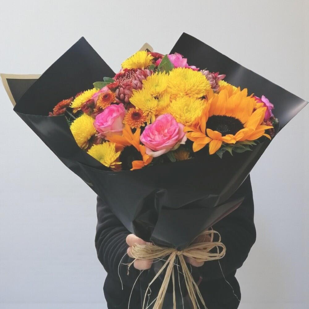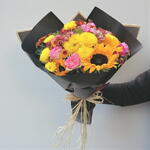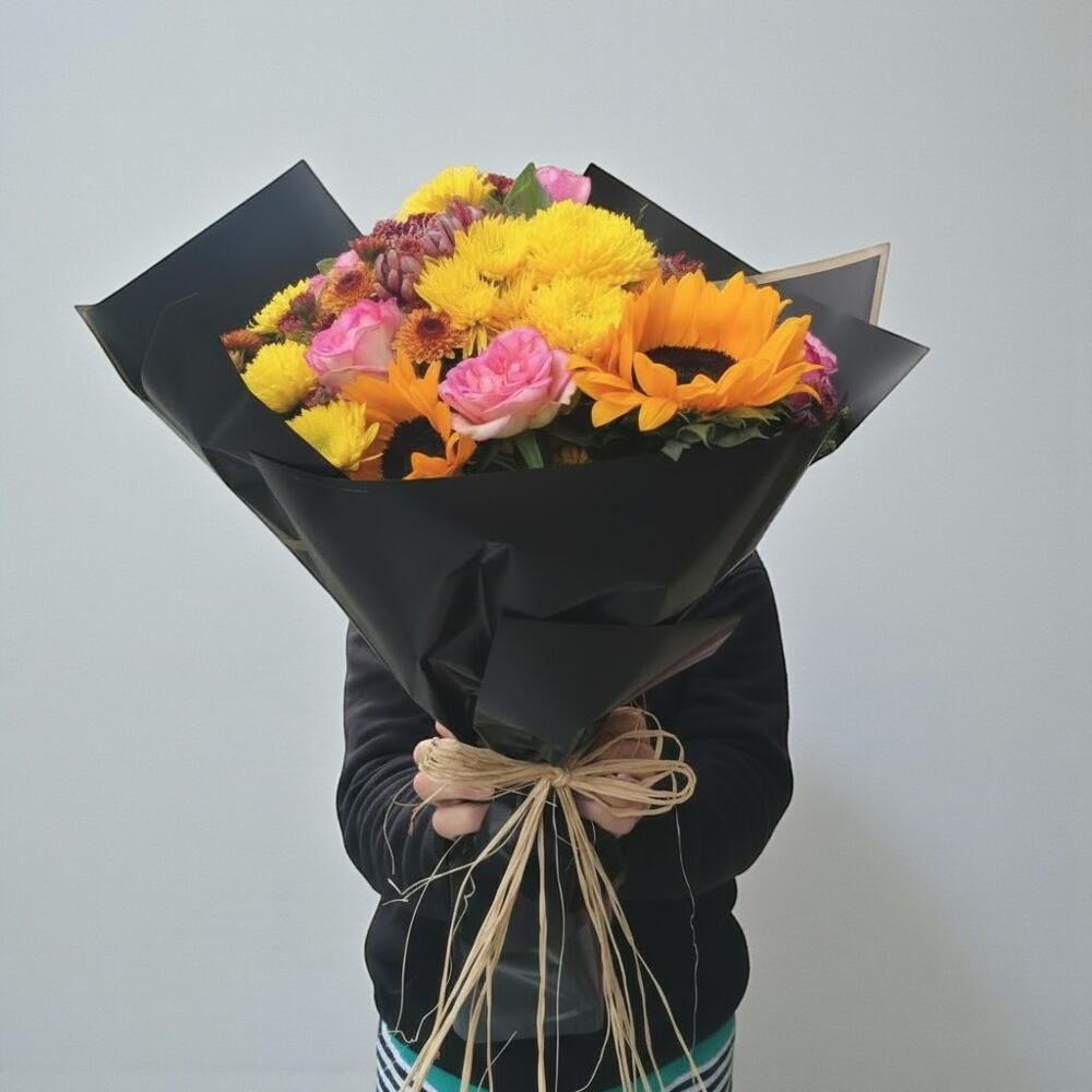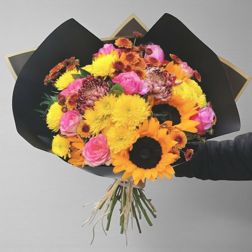 Buket, güneşin neşesini yansıtan canlı bir renk paletine sahiptir. Sarı ve turuncu ayçiçekleri, pembe ve sarı krizantemler ve mor çiçekler, enerjik bir hava yaratır. Buketin dokusu, siyah ambalaj ve doğal jüt ip ile zarif bir şekilde tamamlanmıştır. İster özel bir kutlama, ister sadece sevdiklerinize moral vermek amacıyla tercih edilebilecek bu buket, her ortamda göz alıcı bir etki bırakacaktır. Buketin uzun ömürlü olması için, çiçekleri serin bir ortamda tutmalı ve her gün suyu yenileyerek taze kalmalarını sağlamalısınız.