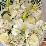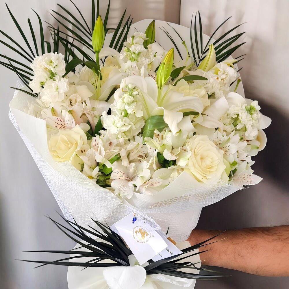 Alstroemeria - 10 adet Lilium - 4 adet beyaz papatya - 5 adet beyaz gul - 3 adet dekoratif yeşillikler - 5 adet
