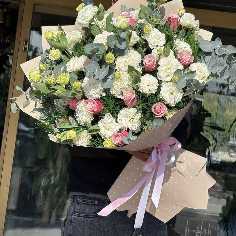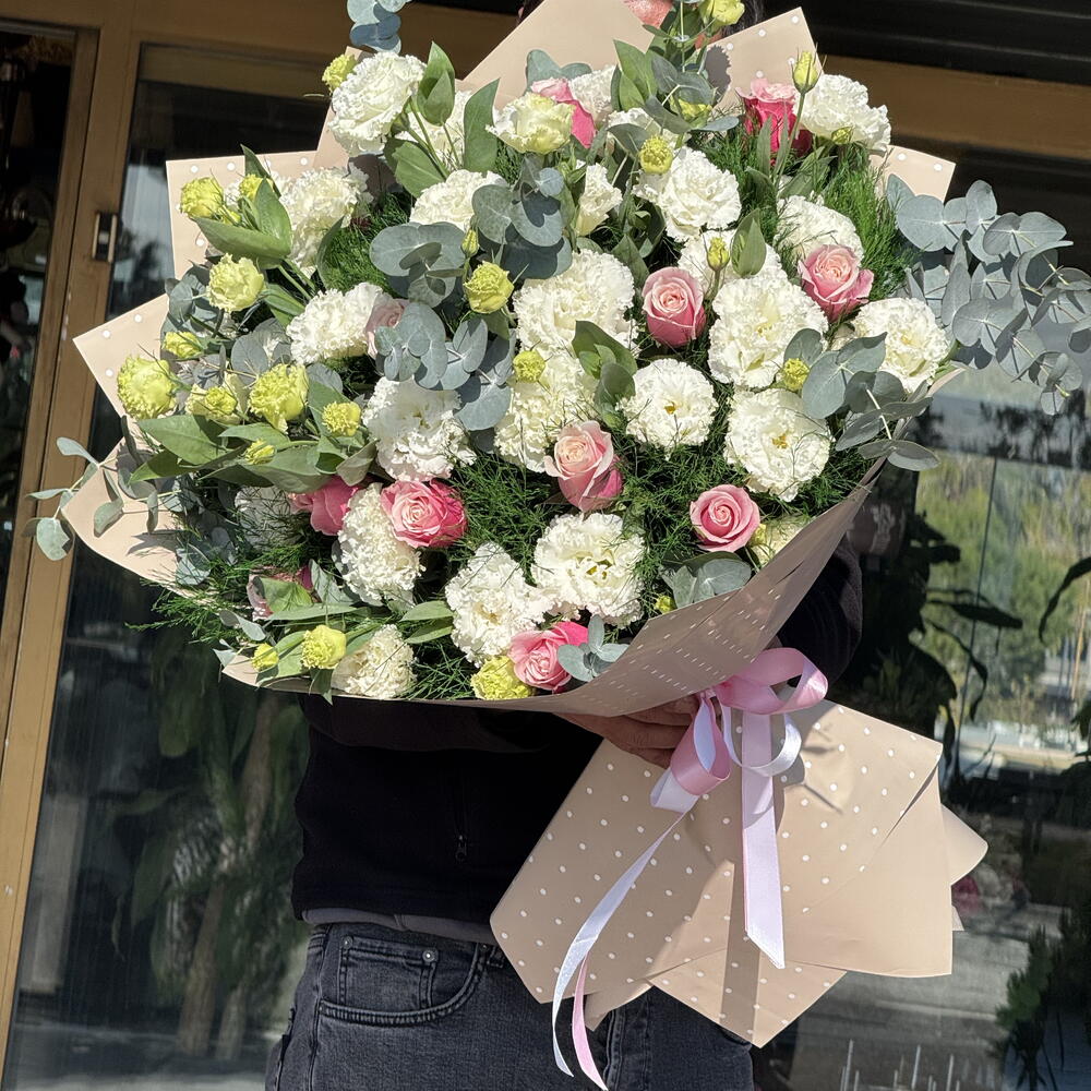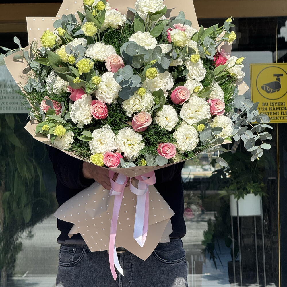 Büyüleyici yazarın buketi her tatil için ideal bir hediye olacaktır. Kompozisyonun ana vurgusu 11 çiçekli kar beyazı eustoma. Parlak vurgu güllerdi - toplamda 13 parça, bitkilerin geri kalanıyla uyumlu bir şekilde birleşiyor. Okaliptüs 9 parça ile bukete eşsiz bir tazelik ve doğallık kazandırmıştır. Enfes kuşkonmaz, 20 dal ile temsil edilerek kompozisyonu havadar ve hafif hale getirir. Bu buket, doğal güzellik ve estetiğin gerçek uzmanları için yaratılmıştır!