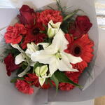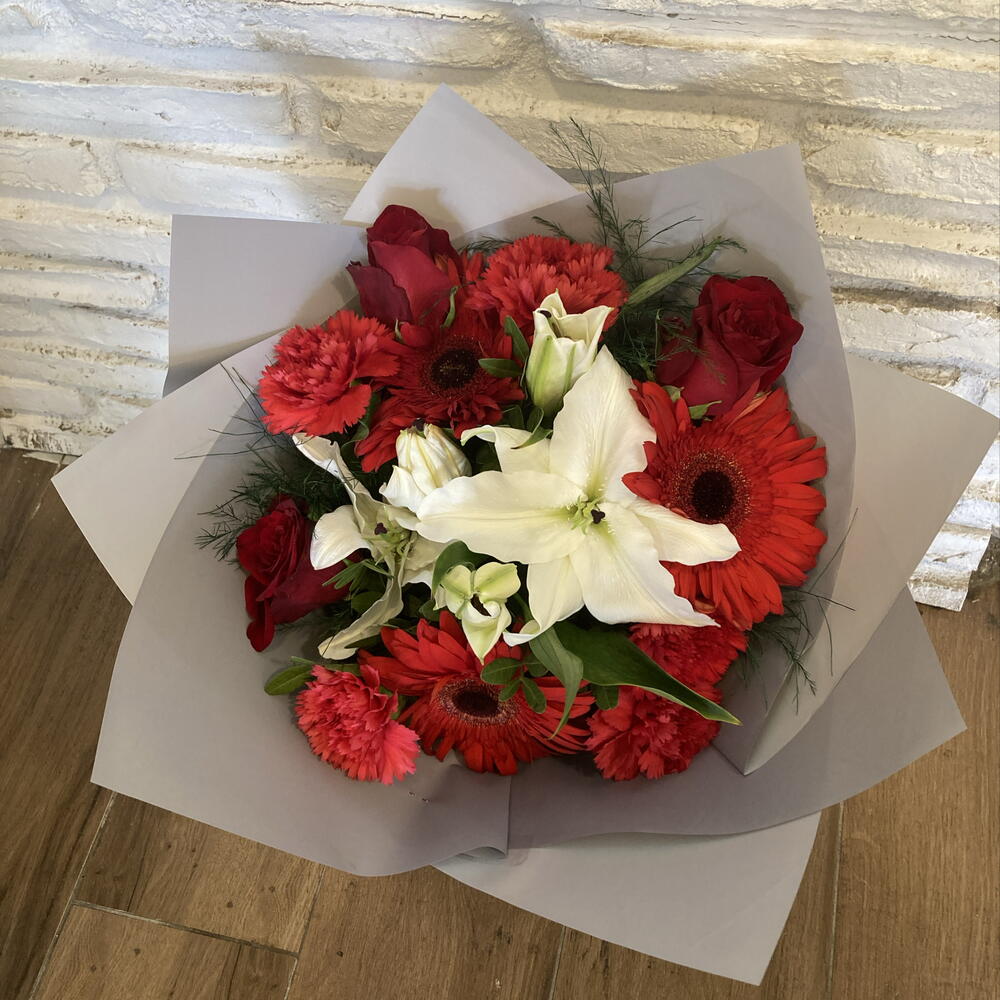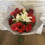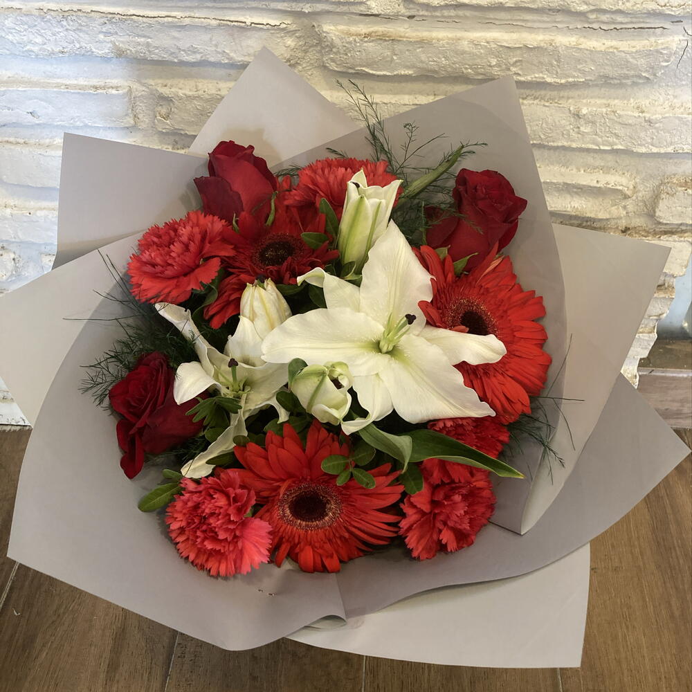 kırmızı gül - 3 adet buket kağıdı - 3 adet beyaz lilyum kandili - 5 adet kırmızı karanfil - 5 adet kırmızı gerbera - 3 adet