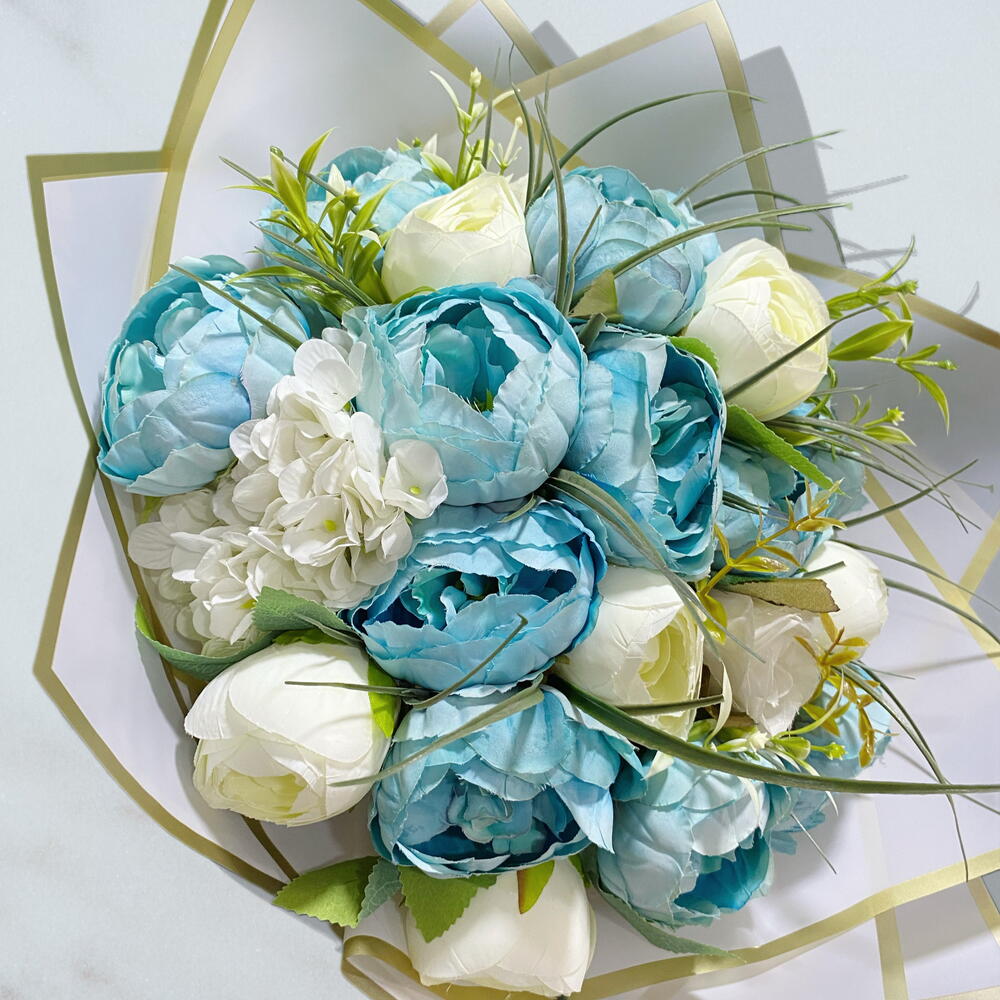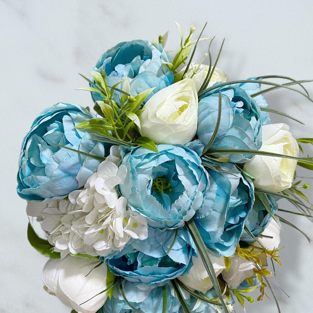 Şakayıklı mavi ve beyaz güllü buket