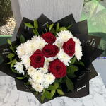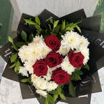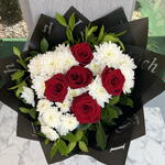 buket kağıdı - 4 adet yeşillik - 10 adet krizantem beyaz - 15 adet gül ithal kırmızı - 5 adet