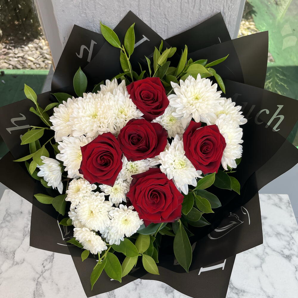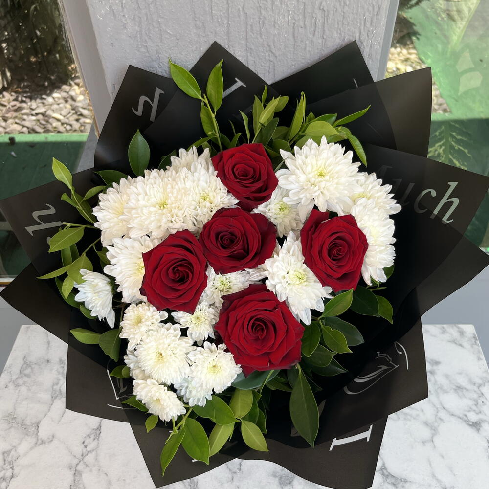 buket kağıdı - 4 adet yeşillik - 10 adet krizantem beyaz - 15 adet gül ithal kırmızı - 5 adet