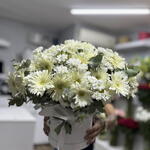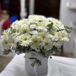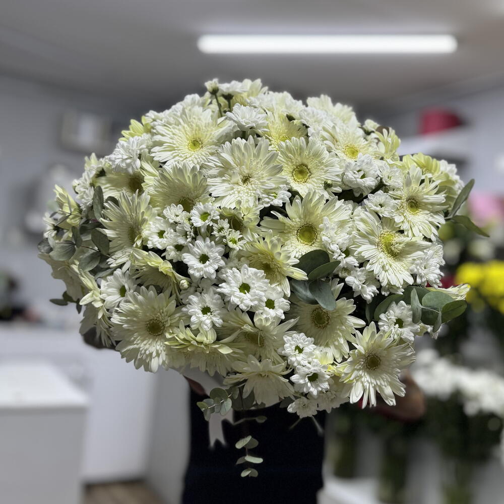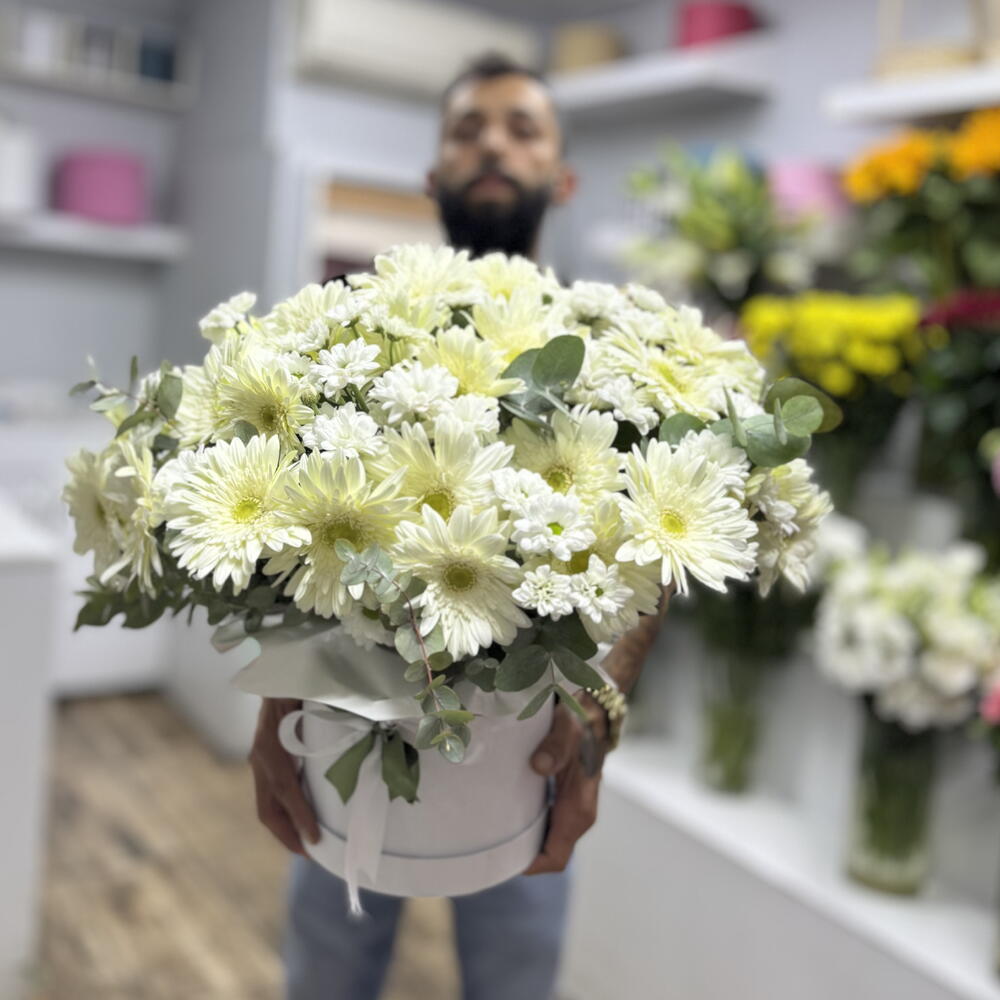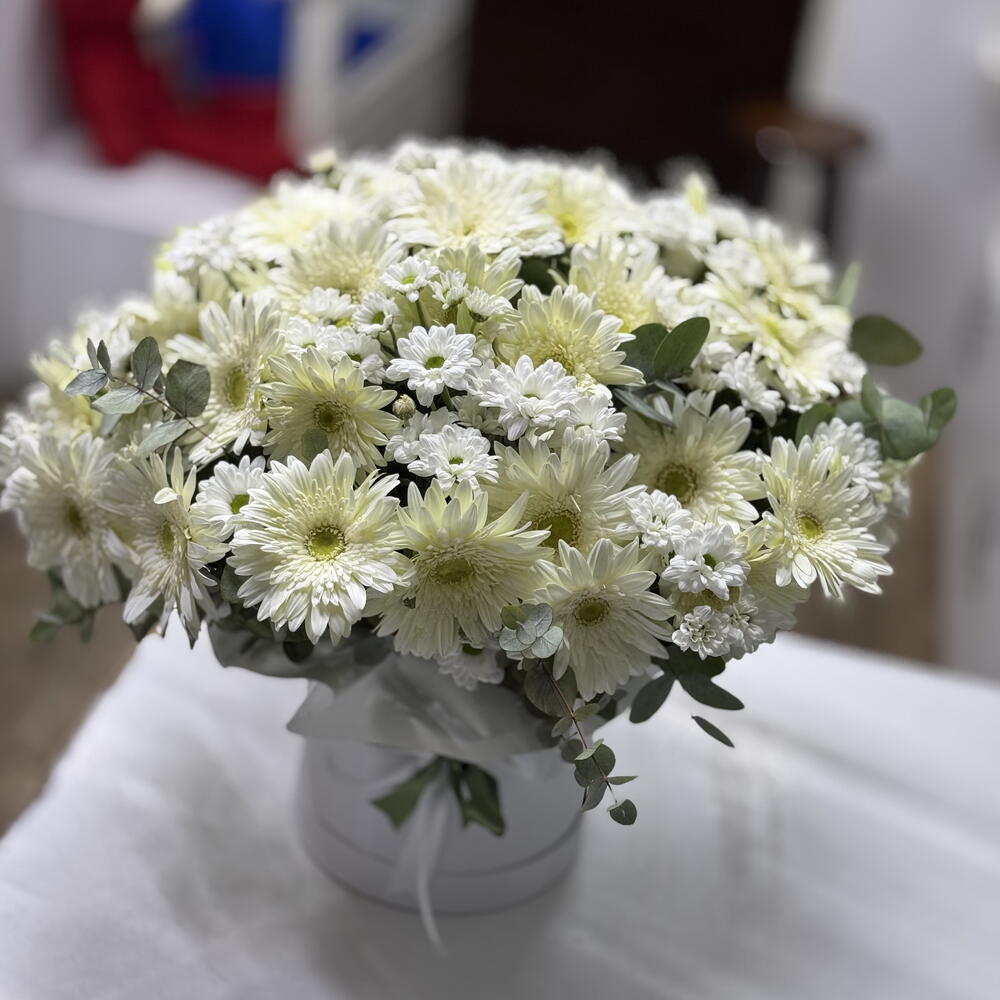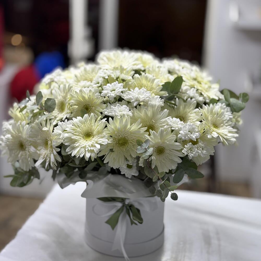 okaliptüs - 30 adet papatya beyaz - 20 adet gerbera beyaz - 40 adet kutu beyaz - 1 adet