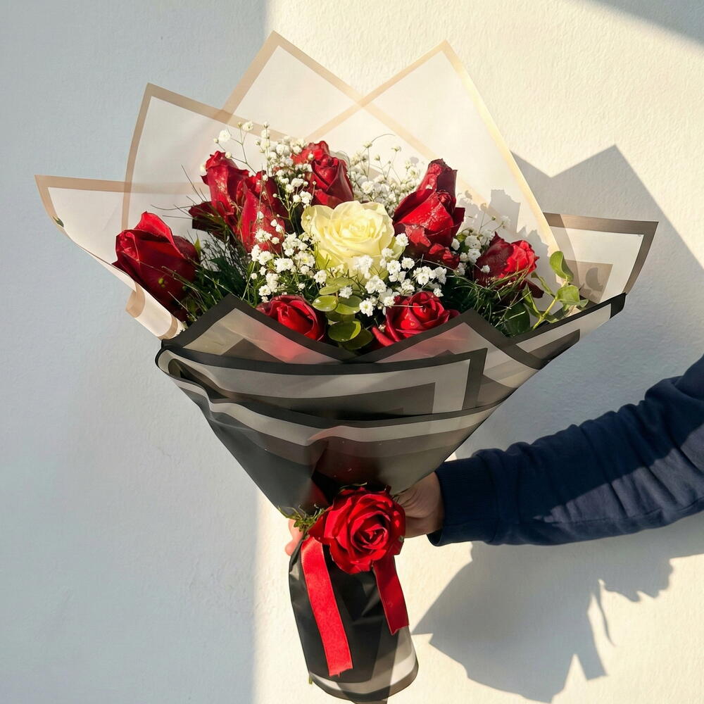 Bu zarif Karışık Buket, sevdiklerinize ne kadar özel olduklarını hissettirecek özenle seçilmiş çiçeklerden oluşuyor. Her biri titizlikle seçilmiş 7 adet virgatus, romantik ve tutkulu bir his yaratan 10 adet kırmızı gül, masumiyet ve saflığı simgeleyen 1 adet beyaz gül, taze ve canlı bir dokunuş katmak için 5 adet okaliptus ve davetkar bir görünüm sunan 15 adet cipso çiçeği bu muhteşem buketi oluşturuyor. Buket, 8 adet siyah buket kağıdı ile mükemmel bir biçimde sarılmış ve sofistike bir görünüm kazanmıştır. Bakım Rehberi: Bu zarif çiçek buketinin taze kalması için, çiçekleri su dolu bir vazoya yerleştirmeniz ve her hafta suyu değiştirmeniz yeterlidir. Buketinizi doğrudan güneş ışığından uzak tutarak, uzun süre boyunca taze ve canlı tutabilirsiniz. Sevdiklerinize bu güzel buket ile unutulmaz bir sürpriz yapabilirsiniz!