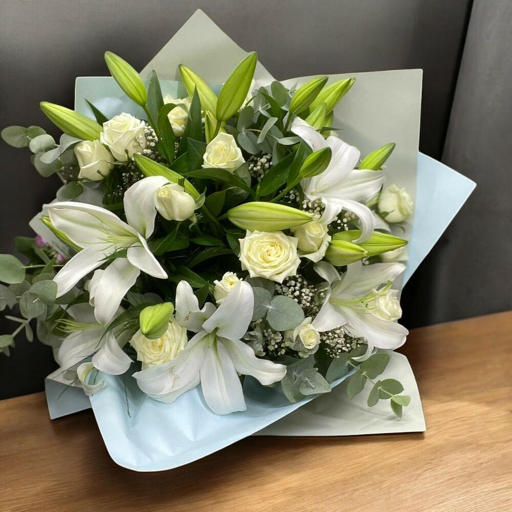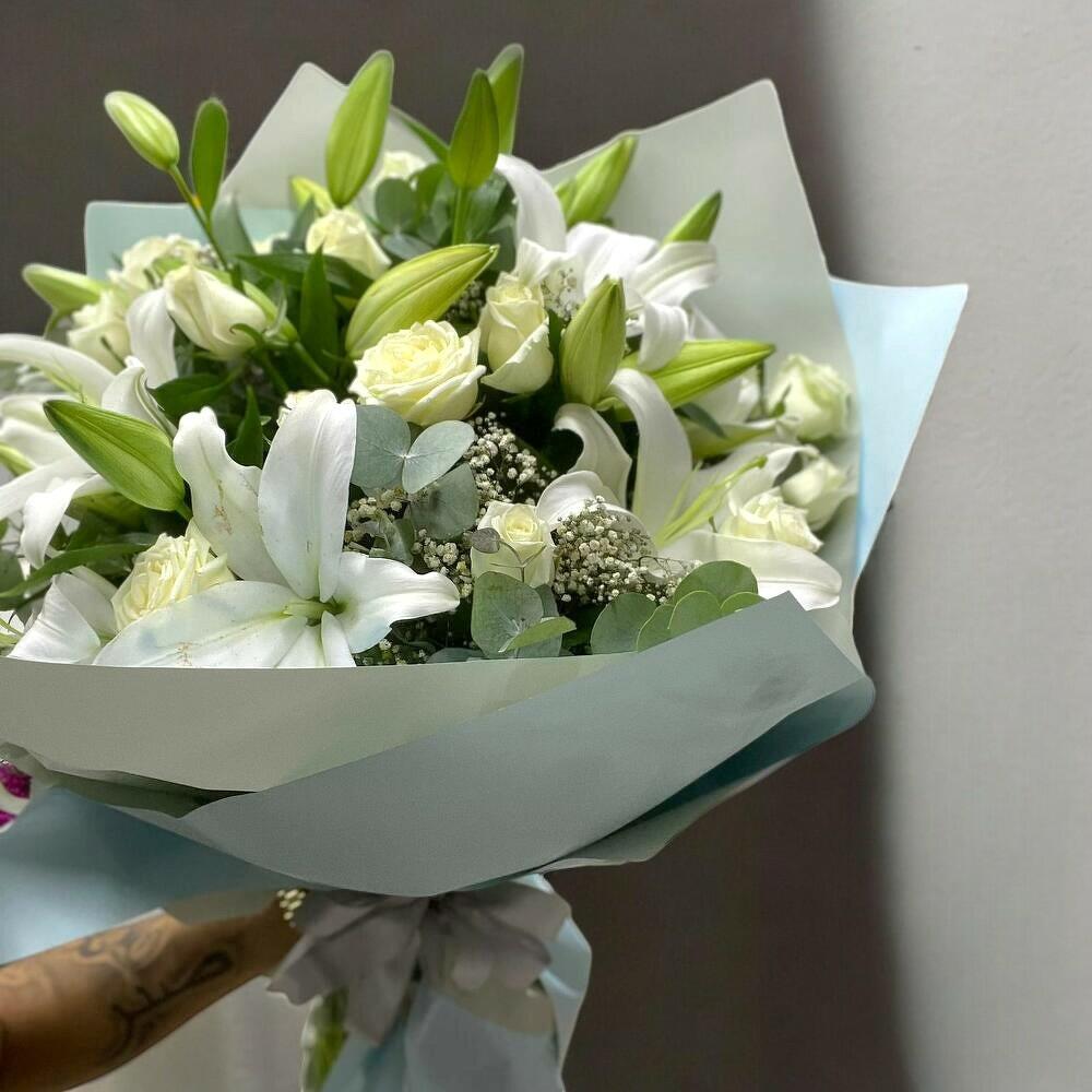 BÜYÜK BOY LİLYUM VE BEYAZ GÜL BUKETİ