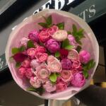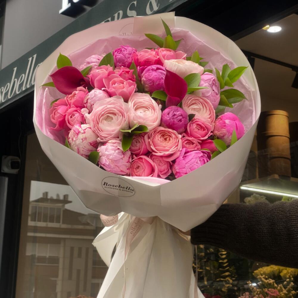 Calm Serenity | Karışık Buket, 5 adet pembe şakayık, 5 adet fuşya şakayık, 2 adet gala, 5 adet “Silva Pink” pembe çardak gül, 4 adet açık pembe erengül (ranunculus) ve taze yeşilliklerle “ruskus” harika şekilde paketlenerek hazırlanmaktadır.