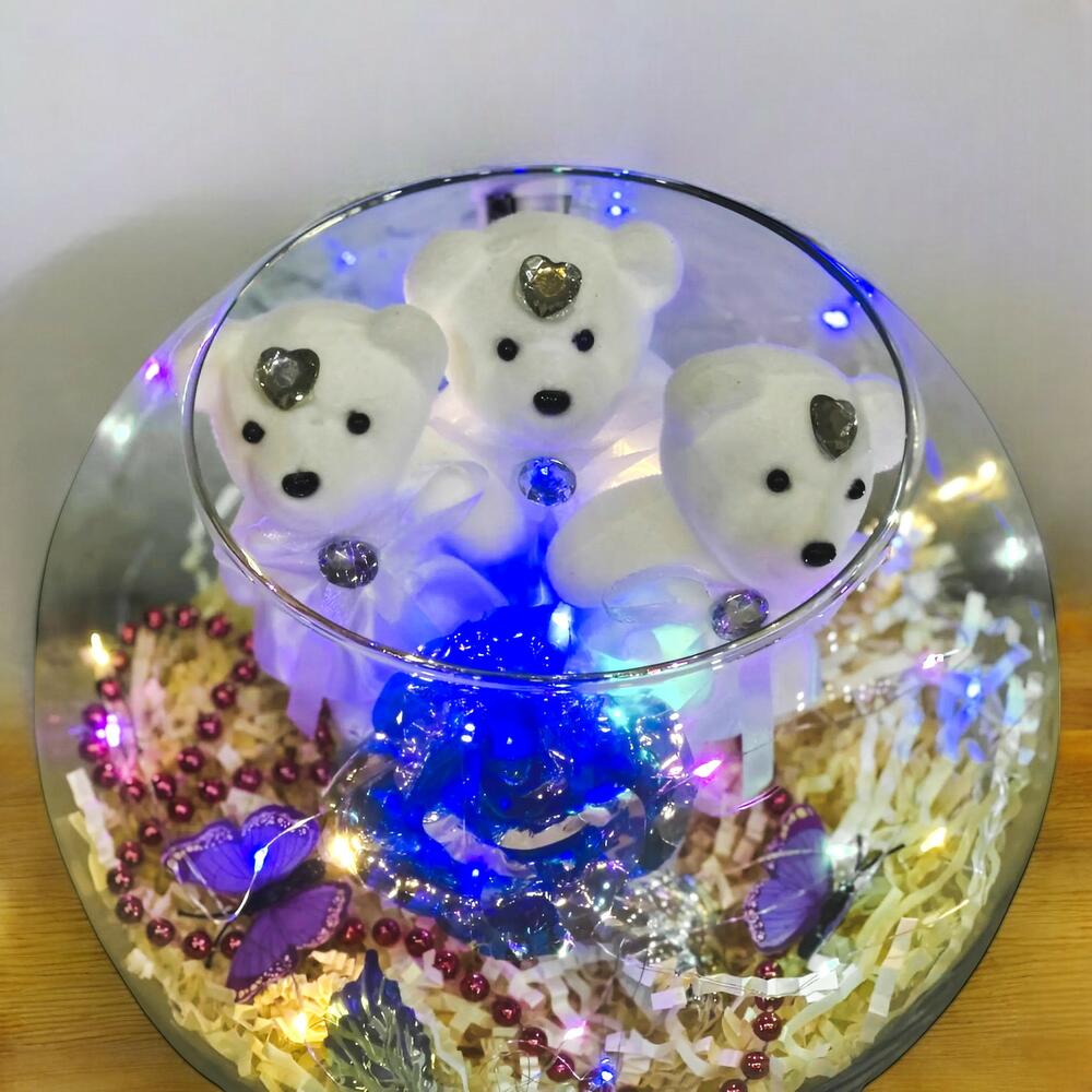 Bu zarif ve şık cam fanus, içindeki 3 adet sevimli ayıcık ve özel yapım saydan gül ile göz alıcı bir dekoratif öğe sunuyor. Fanus içerisindeki led ışıklar, mekanınıza yumuşak bir ışıltı katarken, gül ve ayıcıklar ise romantik bir atmosfer yaratıyor. Bu tasarım, sevdiklerinize verebileceğiniz en özel ve anlamlı hediyelerden biri olacak. Bakım Rehberi: Bu dekoratif tasarım için bakım gereksinimleri oldukça basittir. LED ışıkları dikkatlice kullanın ve doğrudan güneş ışığından uzak tutun. Ayıcıklar ve gül uzun süre dayanacak şekilde tasarlanmıştır, bu yüzden ekstra bakım gerektirmez. Işıkları arada bir açıp kapayarak fanusun estetik görünümünü her zaman taze tutabilirsiniz.