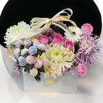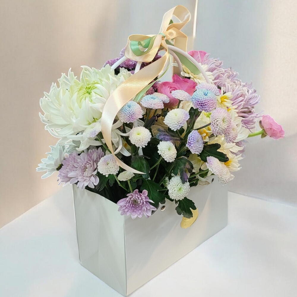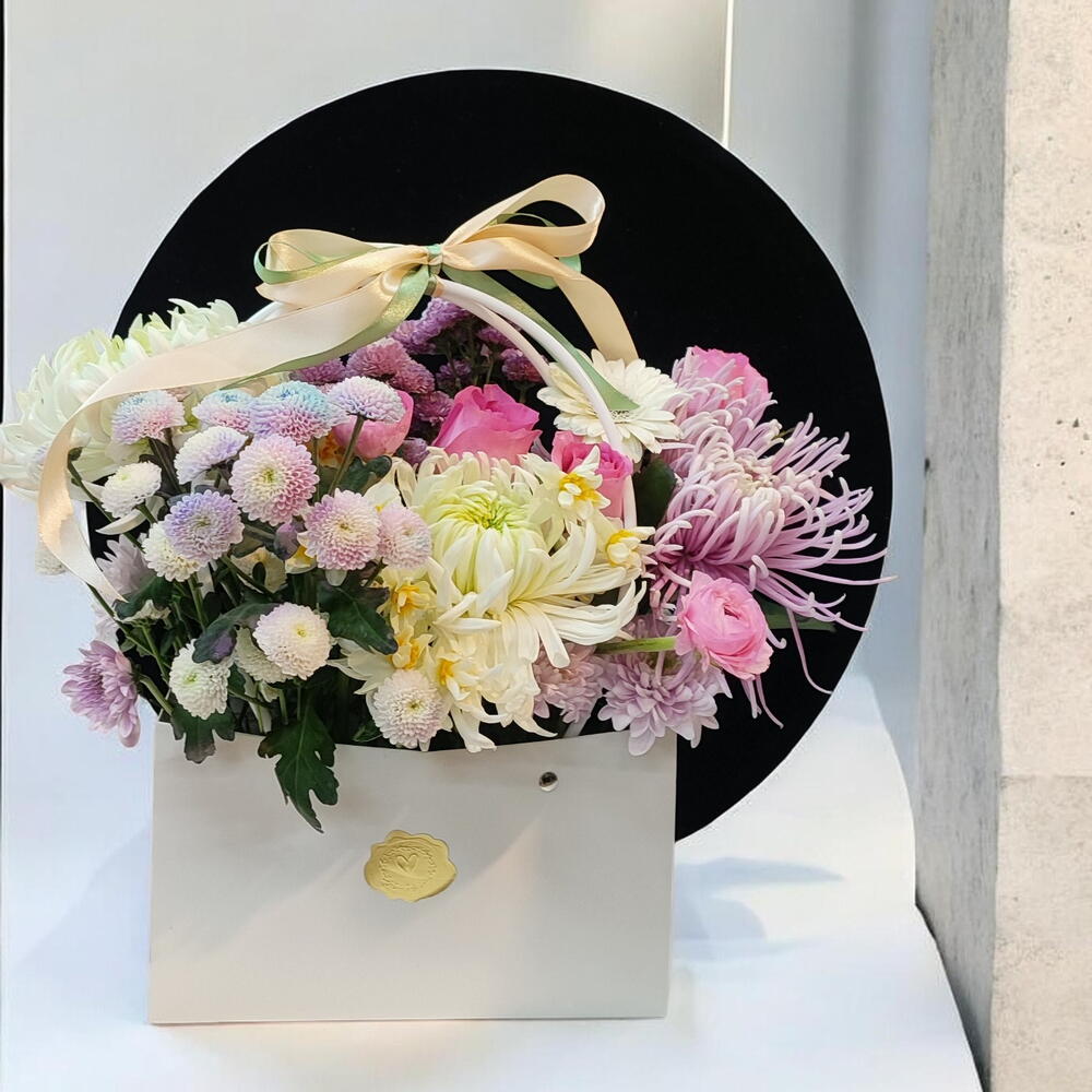 mini gerbera - 1 adet anastasia - 3 adet pembe ithal gül - 5 adet pon pon krizantem rainbow - 5 adet pon pon krizantem lila - 3 adet