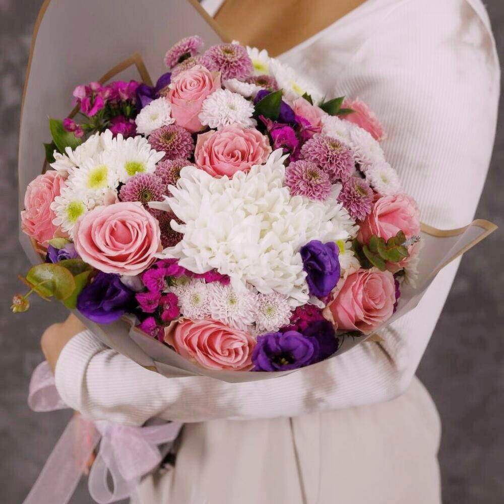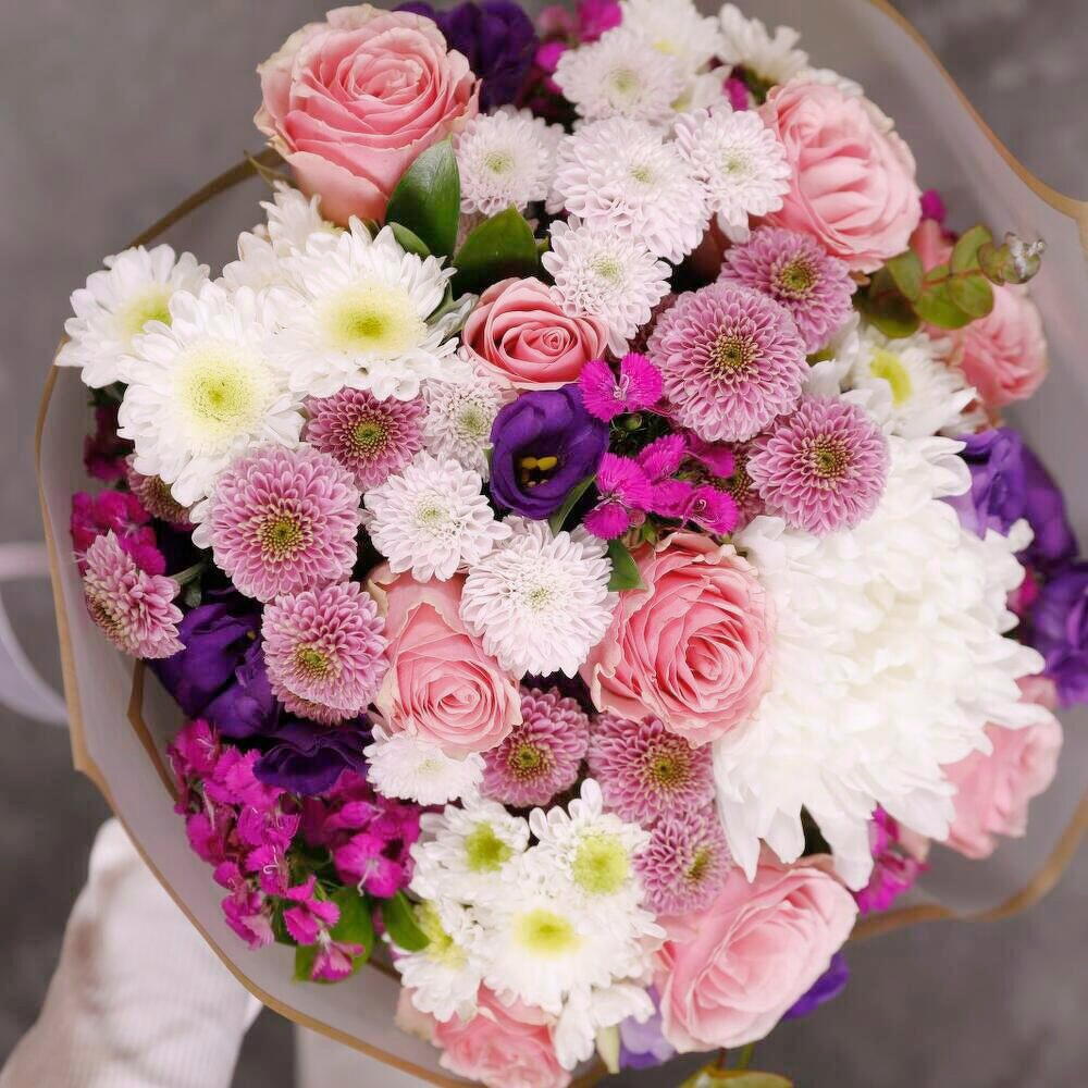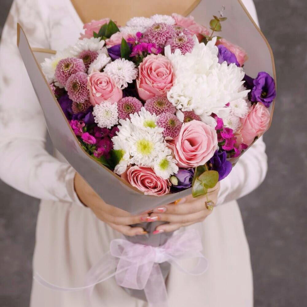 Bu zarif buket, romantik pembe güllerin, asil beyaz kasımpatılarla buluştuğu göz alıcı bir aranjmandır. Mor lisyantuslar ve statice çiçekleri, bukete sofistike bir hava katarken dekoratif yeşilliklerle tazelik ve doğallık kazandırılmıştır. Canlı renk tonlarının mükemmel uyumu, özel günlerde duygularınızı en zarif şekilde ifade etmenizi sağlar. Buketin uzun ömürlü olması için doğrudan güneş ışığından uzak tutulmalı, suyu her gün tazelenmeli ve sapları düzenli olarak kesilmelidir. Şık ve modern tasarımıyla bu buket, sevdiklerinize unutulmaz bir sürpriz yapmanız için ideal bir tercihtir.
