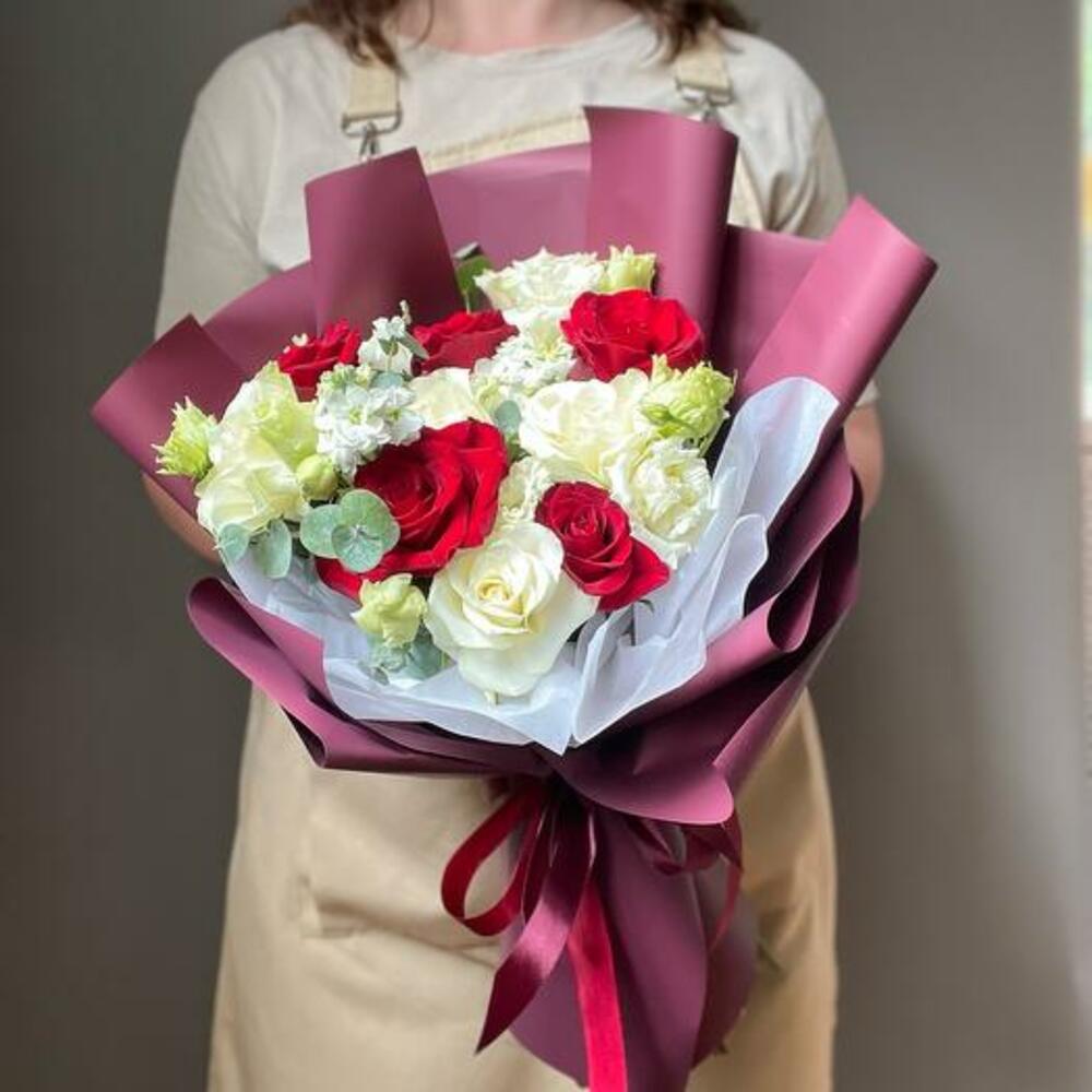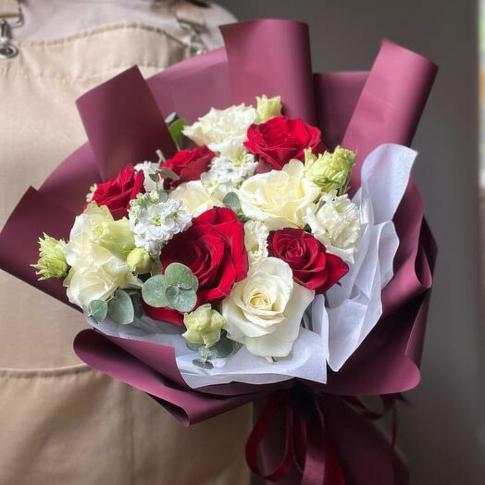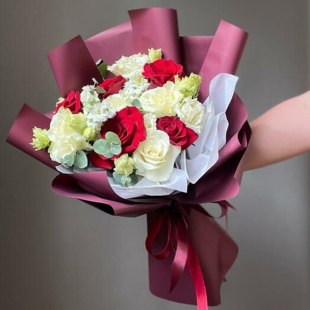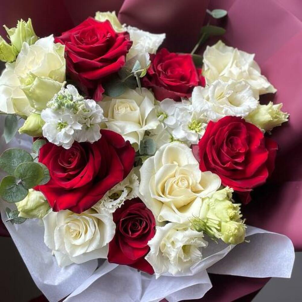 Güller, eustoma, matthiola ve okaliptüslerden oluşan göz kamaştırıcı bir topluluk olan buketimizin enfes cazibesine kendinizi bırakın. Bu buket, parlak kırmızıları narin beyazlarla iç içe geçirerek, zamansız zarafetiyle her ortamı yükselten çarpıcı bir ifade parçası vaat ediyor.