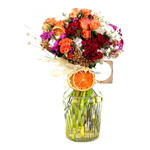 Bu muhteşem dekoratif çiçek aranjmanı, 6 adet turuncu gül, 6 adet kırmızı karanfil, 2 adet beyaz krizantem, 2 adet yeşil hypericum, 4 adet kuru başak ve 2 adet kuru portakal dilimi ile zenginleştirilmiştir. Her biri özenle seçilmiş olan bu çiçekler, evinize veya ofisinize zarif ve sıcak bir atmosfer katacak. Bu şık aranjman, hem kendiniz için harika bir aksesuar, hem de sevdiklerinize verilecek mükemmel bir hediye olabilir.