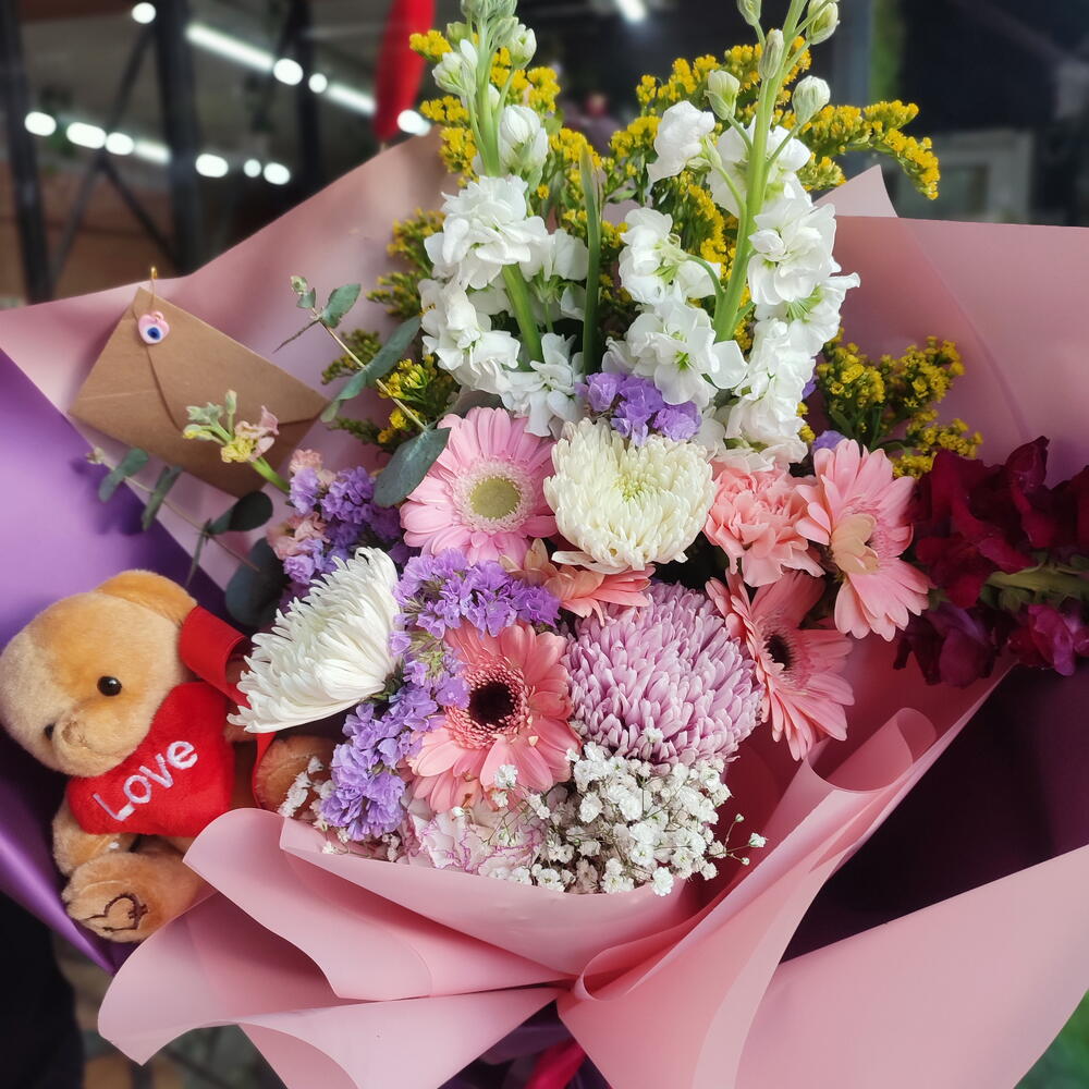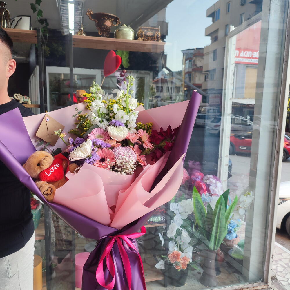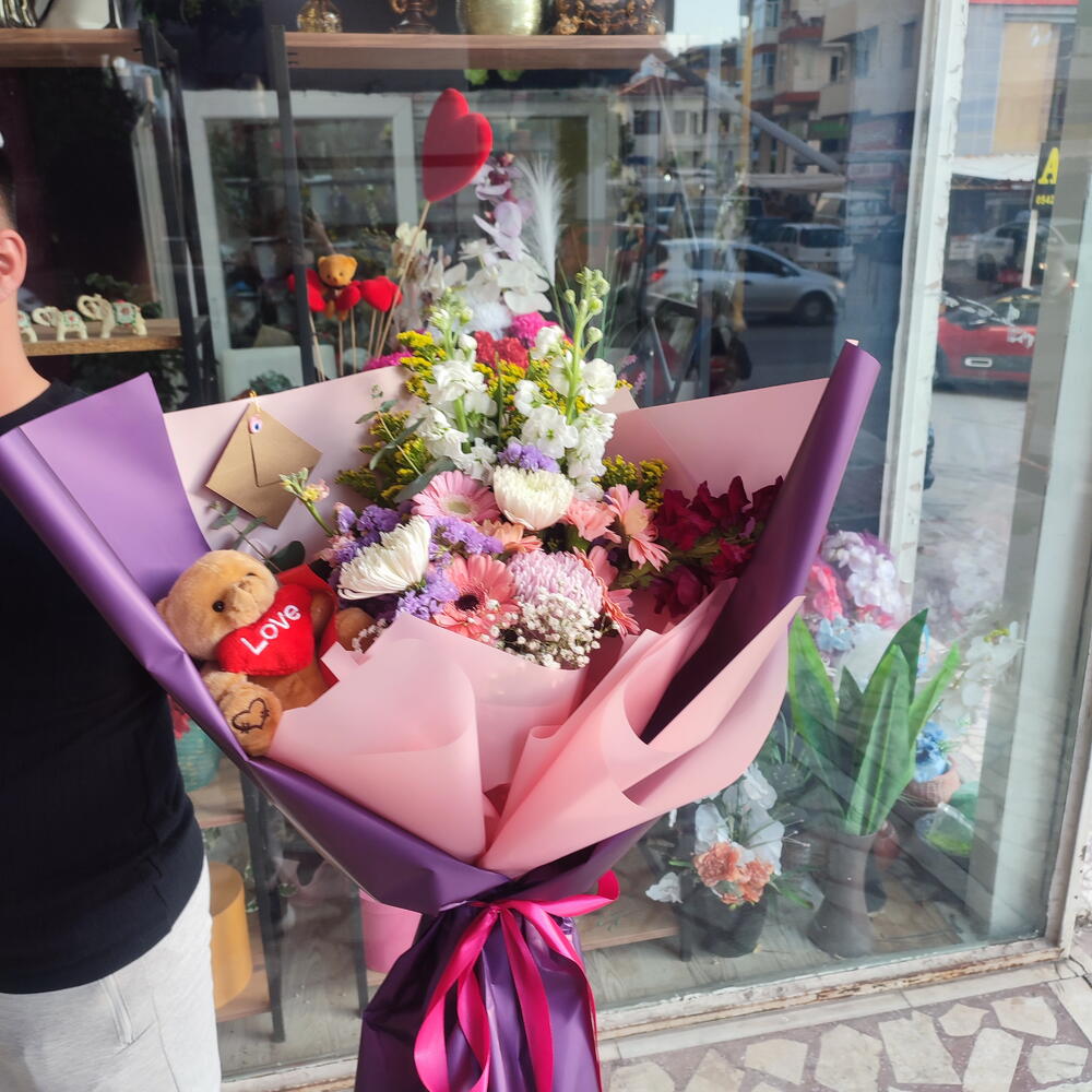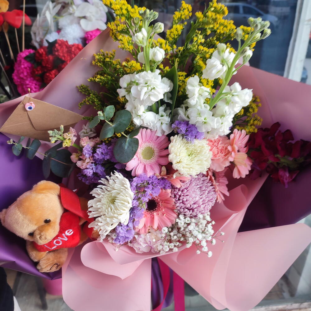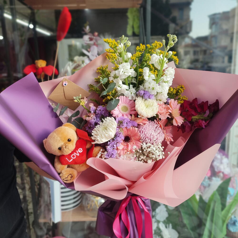 mini gerbera - 5 adet anastasia - 3 adet şebboy - 2 adet okaliptüs dalı - 3 adet cipso çiçeği - 11 adet karanfil somon renkli - 5 adet aslan ağzı çiçeği - 1 adet limonium sinuatum purble - 5 adet solidago nemoralis yellow - 3 adet teddy bear-oyuncak peluş ayıcık - 1 adet