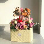 pembe gül - 3 adet beyaz gül - 3 adet ayıcık - 2 adet hüsnü yusuf - 5 adet kasımpatı - 3 adet dekoratif çanta - 1 adet