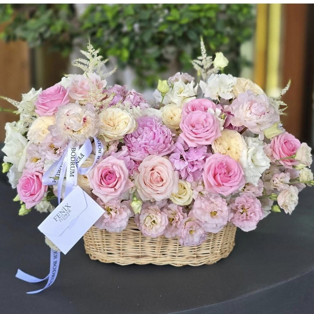Bu büyüleyici Sepette Çiçekler kompozisyonu, 51 adet Eustoma, 7 adet Peony, 15 adet Rosa ve 11 adet çeşitli diğer çiçekler ile dikkatlice hazırlanmıştır. Bu parlak ve canlı çeşitliliği ile her ortama sofistike bir dokunuş ekler. Olağanüstü güzellikteki bu aranjman, sevdiklerinize ne kadar önem verdiğinizi göstermek için mükemmel bir yoldur. Her bir çiçek, uzun ömürlü tazelik ve görkemli bir görünüm sağlamak için özenle seçilmiştir. Bu çarpıcı çiçek aranjmanı, her evin veya ofisin dekorasyonuna zarif bir ek olacaktır.