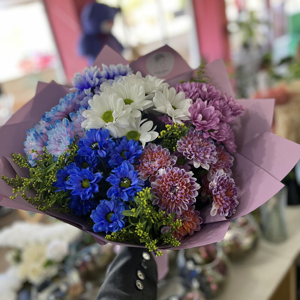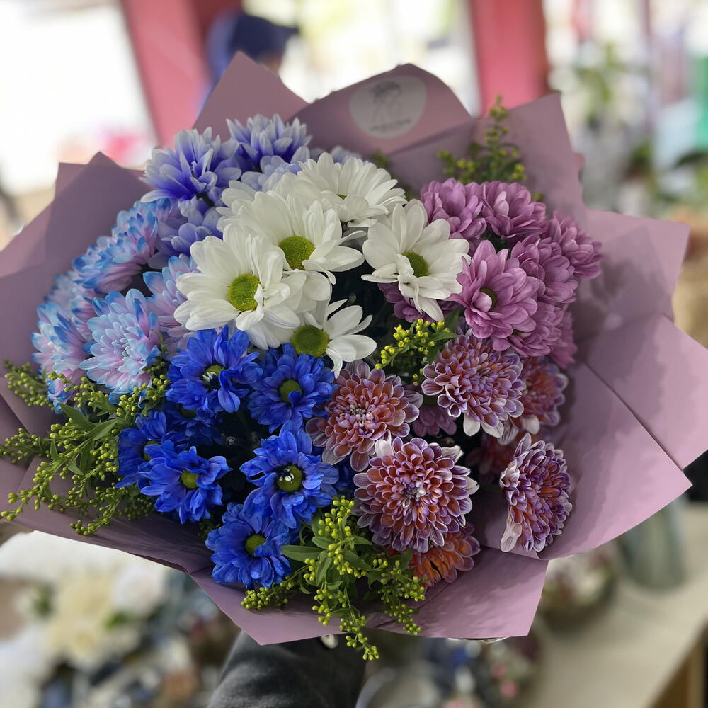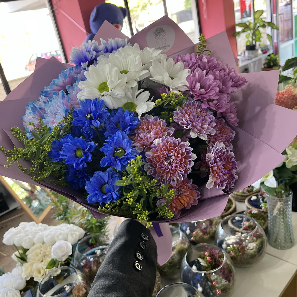 Bu göz alıcı buket, mor, mavi ve beyaz tonlarının büyüleyici uyumuyla zarafeti ve canlılığı bir araya getiriyor. Her bir çiçek, doğanın en güzel renklerini yansıtarak bukete taze ve enerjik bir görünüm kazandırıyor. Modern mor ambalajı ve zarif kurdelesiyle şıklığı ön plana çıkarıyor. Sevdiklerinize duygularınızı ifade etmenin en zarif yolu ya da özel günlerinize renk katacak mükemmel bir seçimdir. Canlı renkleriyle pozitif enerji yayar, her ortama neşe ve huzur getirir. Bu buket, hem klasik hem modern dokunuşlarıyla unutulmaz bir hediye deneyimi sunar.