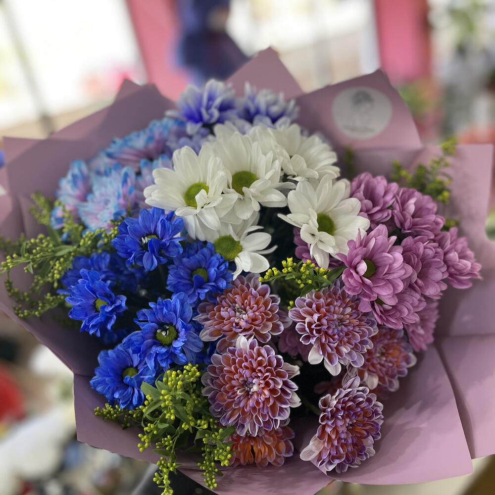 solidaster - 3 adet beyaz papatya - 13 adet pembe papatya - 13 adet mavi papatya - 15 adet mor kasımpatı (chrysanthemum) - 7 adet mavi kasımpatı - 7 adet