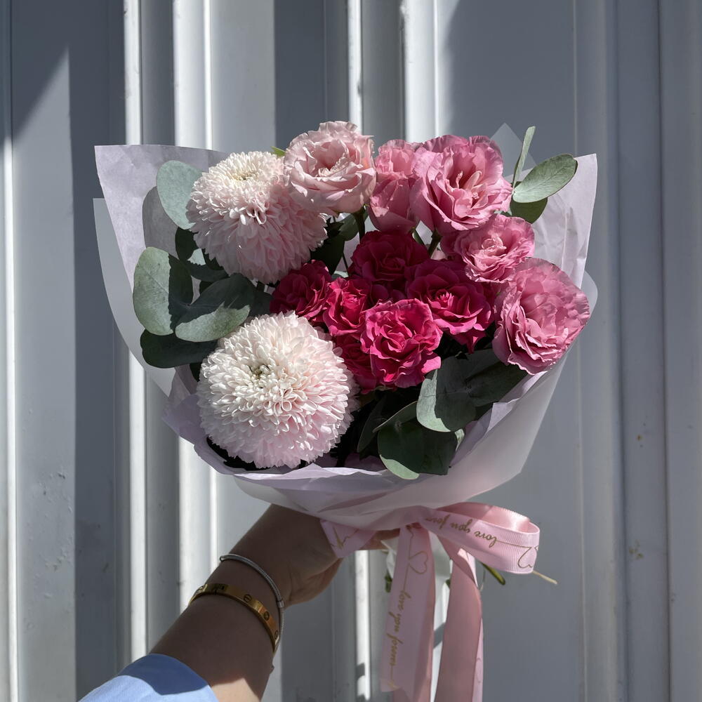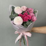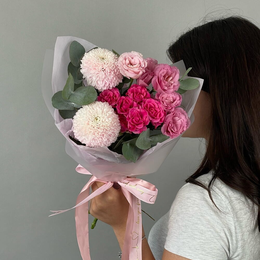 Popüler parlak pembe renklerde şık bir tebrik buketi. Burada en popüler ve mevsimlik çiçekler toplanmıştır: eustoma, güller, Hollanda krizantemleri ve mavi okaliptüs yeşillikleri. Buket hoş kokulu ve çok canlı 🩷🩷🩷