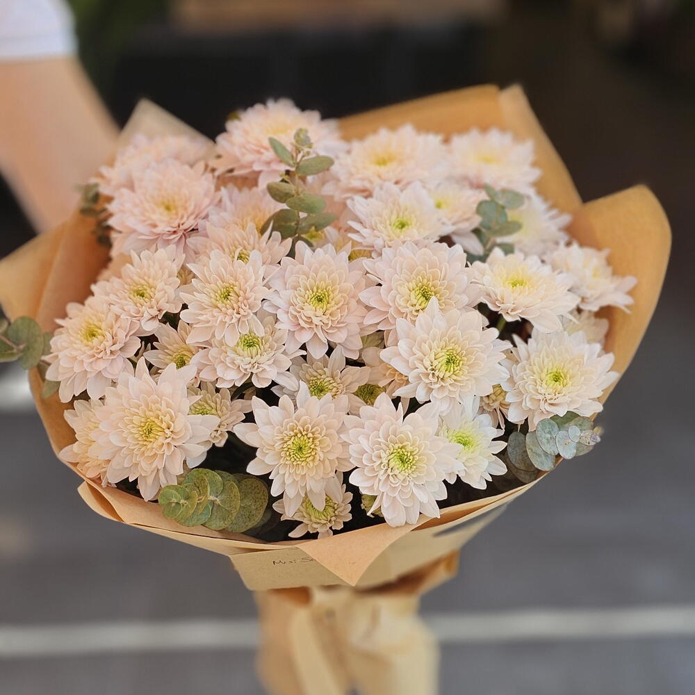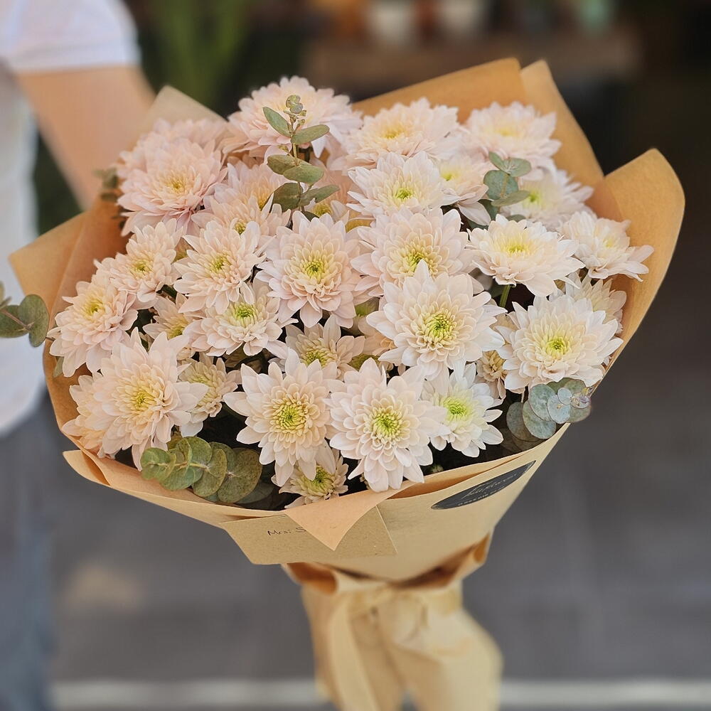 Bu eşsiz çiçek buketi, 5 adet taze okaliptüs ve 9 adet ihtişamlı krizantem ile hazırlanmıştır. Çiçeklerin canlılığı ve keskin kokusuyle etrafına enerji verir, yaşam başarısı ve mutluluğun simgesi olan krizantemler ise size ve sevdiklerinize iyi dileklerini iletecek. Şık bir hediye veya muhteşem bir dekorasyon seçeneği olarak ilham verici bir seçim. Kendinizi veya sevdiklerinizi, bu cazibeli çiçek buketi ile şımartın.