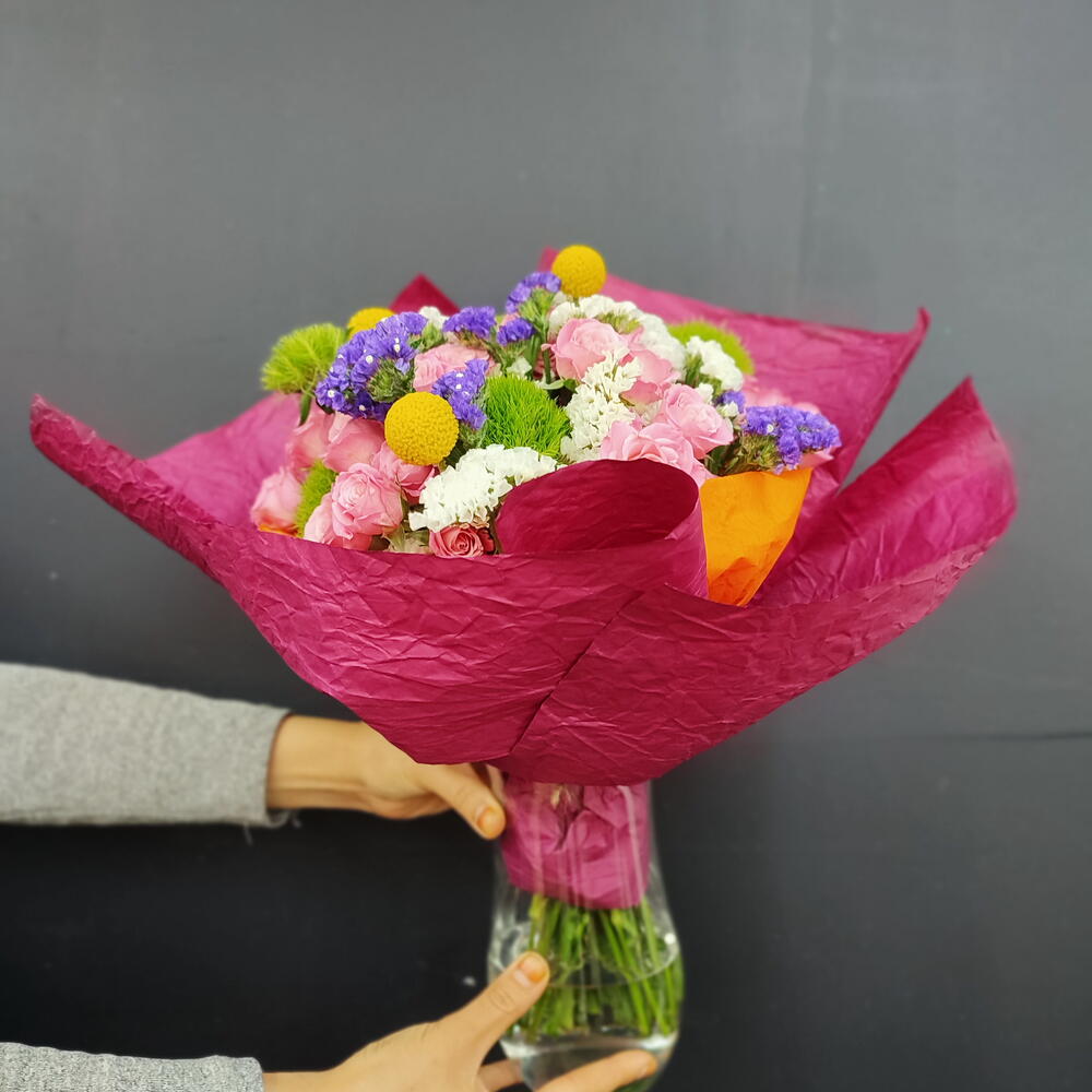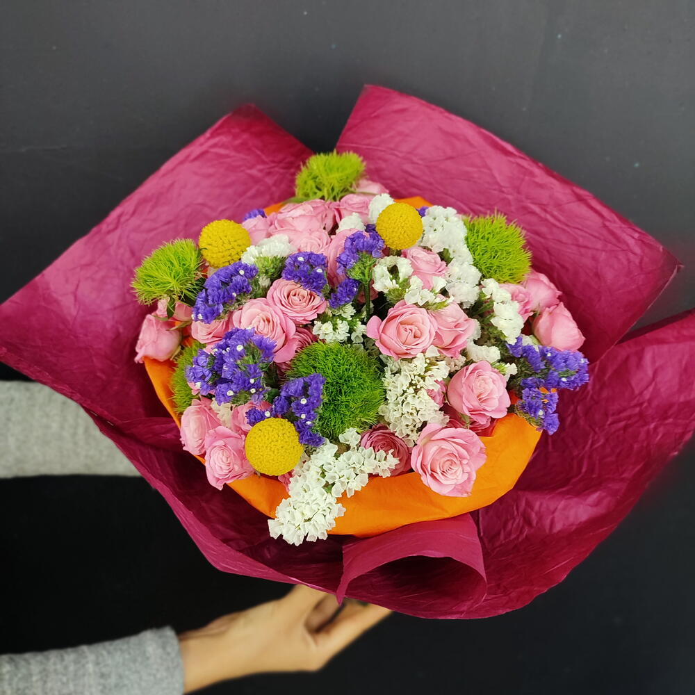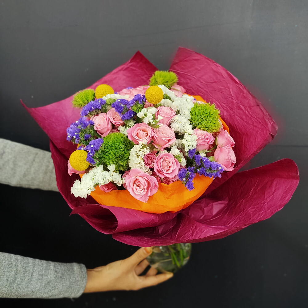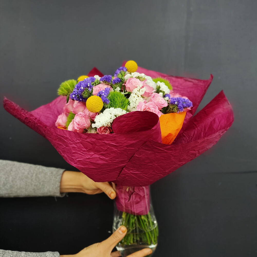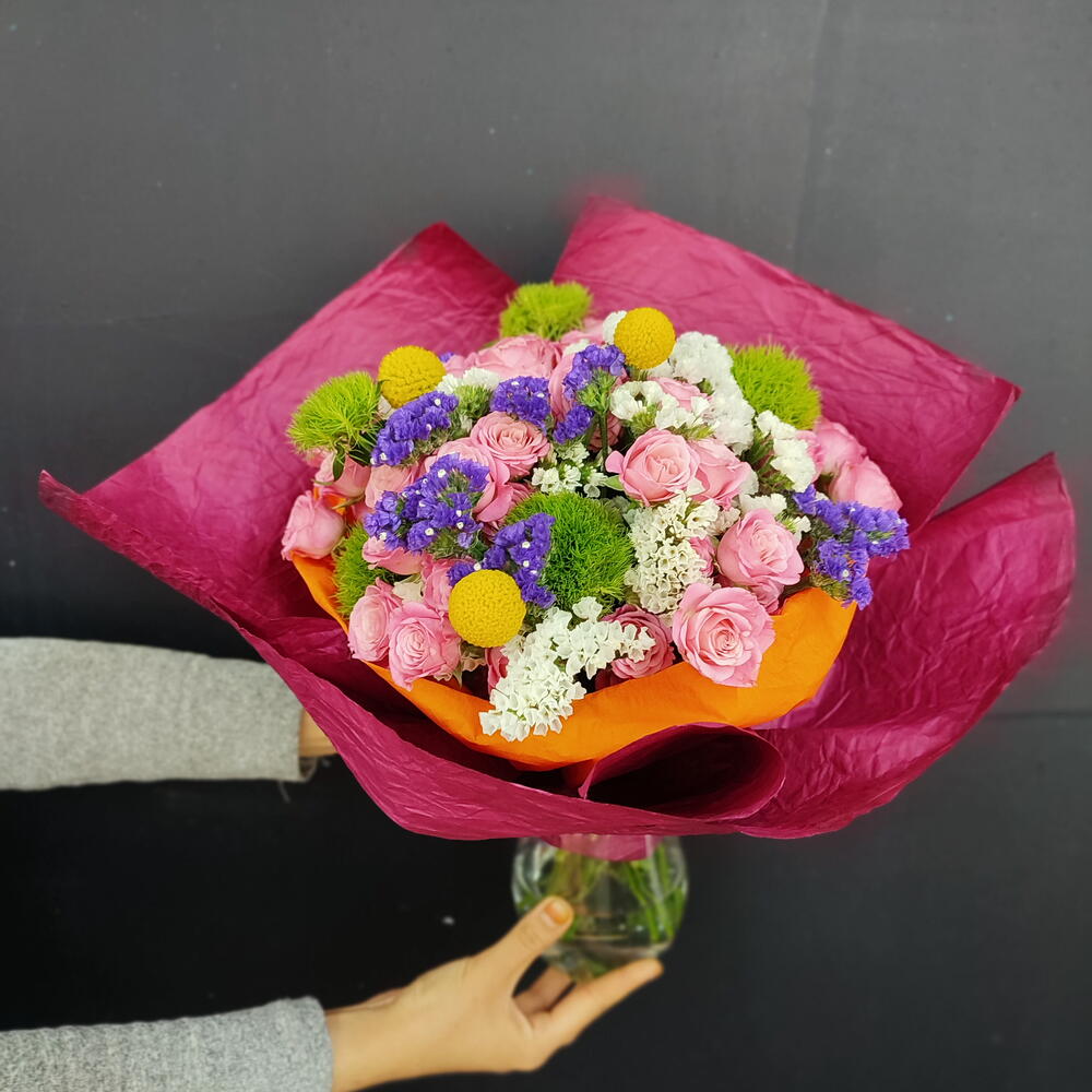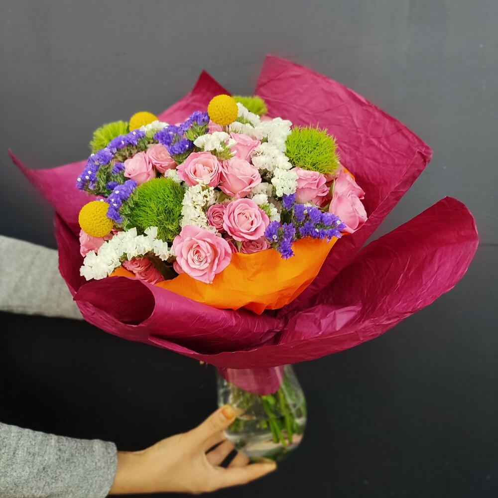 Bu harika Karışık Buket, 5 adet sofistike yeşil trick (gül), 30 adet zarif pembe çardak gülü, 7 adet deniz lavantası mor, 7 adet beyaz deniz lavantası ve 3 adet sarı top bitki dekoru ile dolup taşıyor. Bu taze ve çekici birleşim, her türlü özel anınızı unutulmaz kılar ve hem modern hem de geleneksel dekor stillerine uyar. İster büyük bir özel etkinlik için, ister sadece kendinizi şımartmak için olsun, bu çiçek buketi mükemmel bir seçimdir.