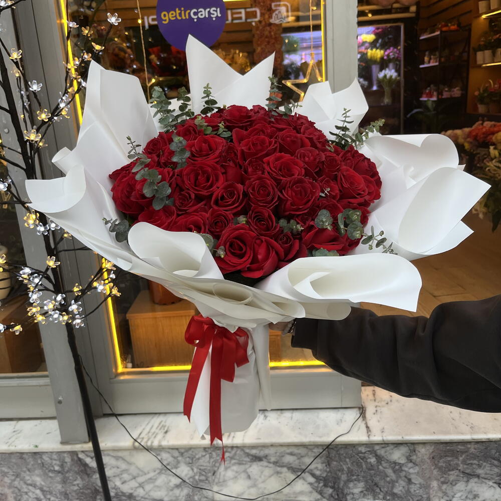 kırmızı gül - 70 adet okaliptus - 20 adet