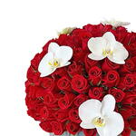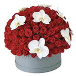 Gri silindir kutuda sunulan bu etkileyici aranjman, 100 adet kırmızı gül ve 7 adet beyaz orkide ile hazırlanmıştır. Zarif tasarımı ve etkileyici boyutlarıyla, özel günlerde sevdiklerinize unutulmaz bir hediye sunar.