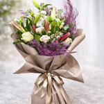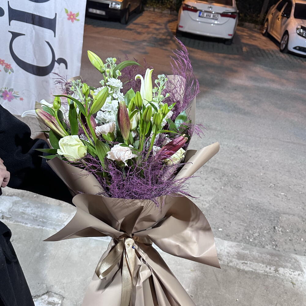 Bu muhteşem Karma Buket, 5 adet lilyum, dolgulu olarak kullanılan 2 adet kuru çiçek, 3 adet zarif beyaz gül, romantik bir dokunuş katan 2 adet pembe gül ve son olarak ambiyansı tamamlayan 3 adet kasımpatı ile oluşuyor. Her biri özenle seçilmiş olan bu çiçekler, size veya sevdiklerinize sunulan neşe ve güzellik vadeder. Göz alıcı bu buket ile her anı unutulmaz kılın.