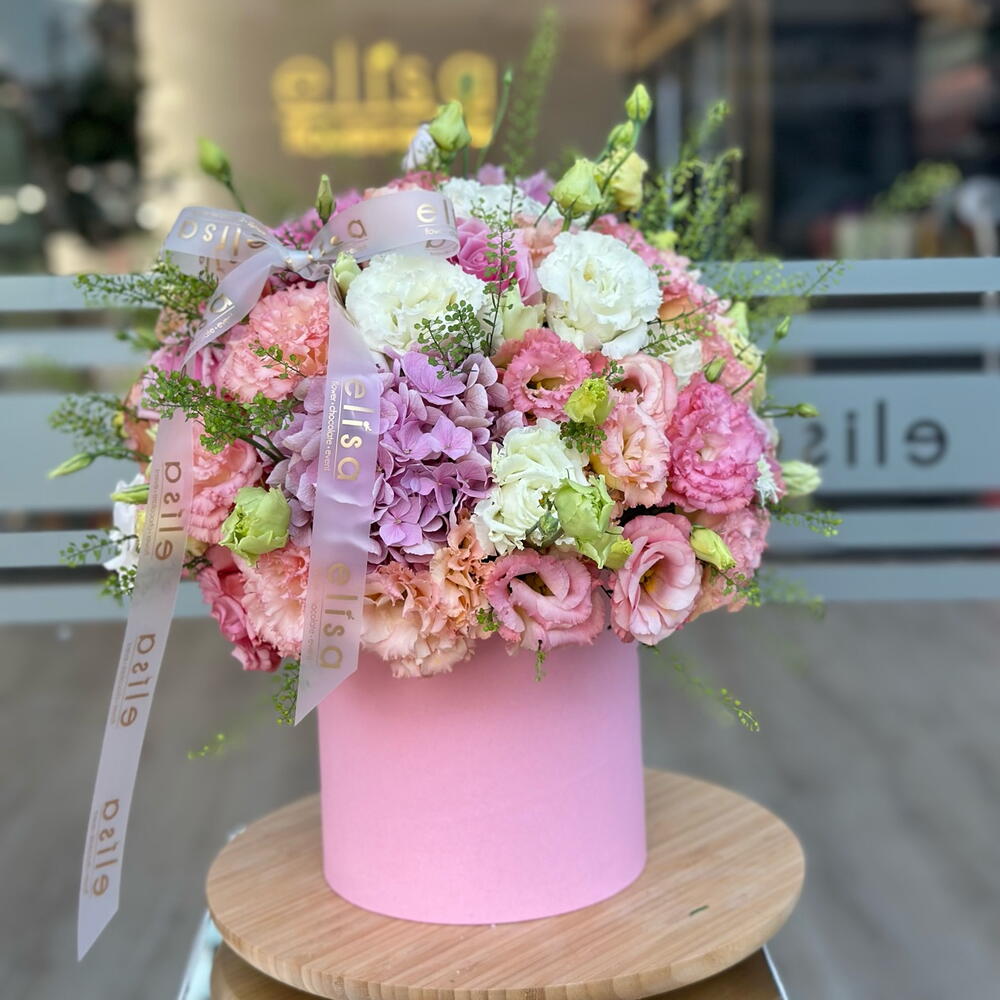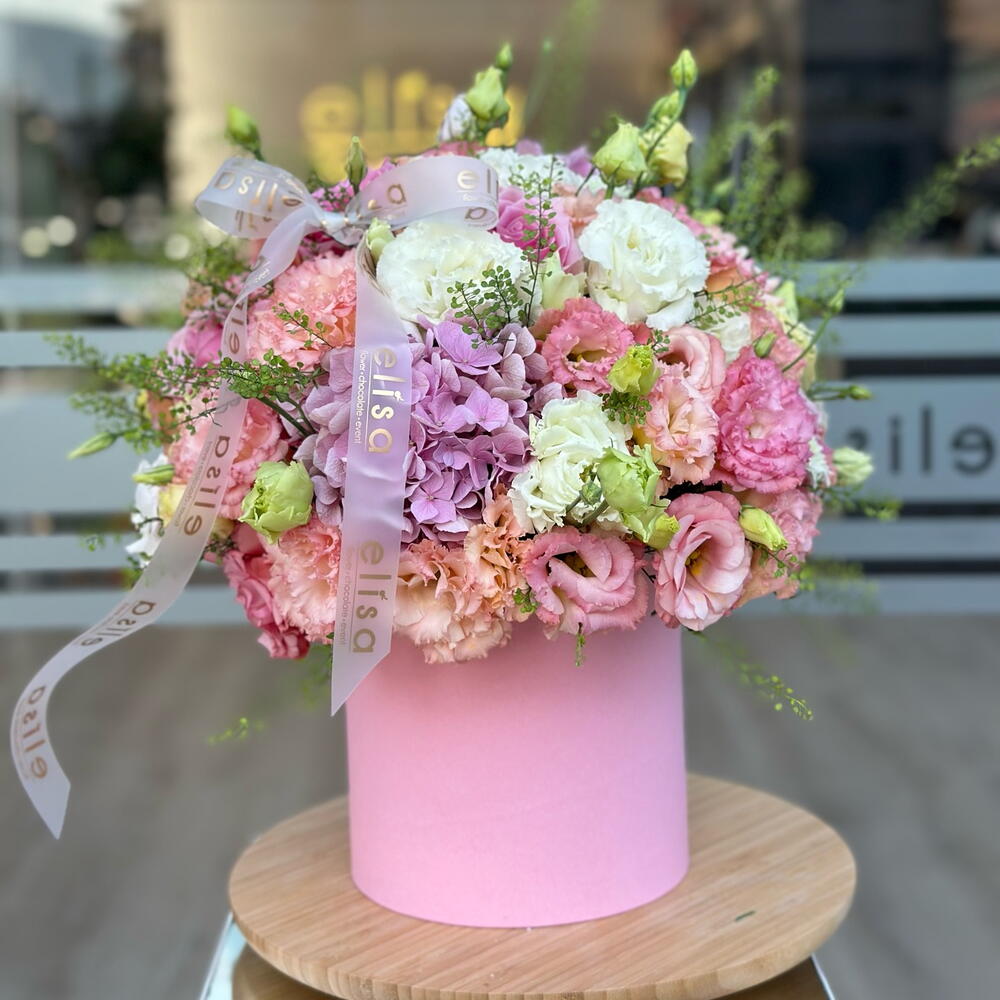 Bu kutuda çiçek aranjmanı, iki adet güzel hydrangea ve 40 adet lisiyantusla birlikte dikkatlice hazırlanmış, beş adet özenle seçilmiş yeşillikle tamamlanmıştır. Bu zarif çiçek düzenlemesi, manzarasını süslemek veya sevdiklerine jest yapmak isteyenler için mükemmeldir. Her bir çiçek seçkin bir şekilde hazırlanıp düzenlenmiştir, bu nedenle düzenleme uzun süre taze ve canlı kalır.