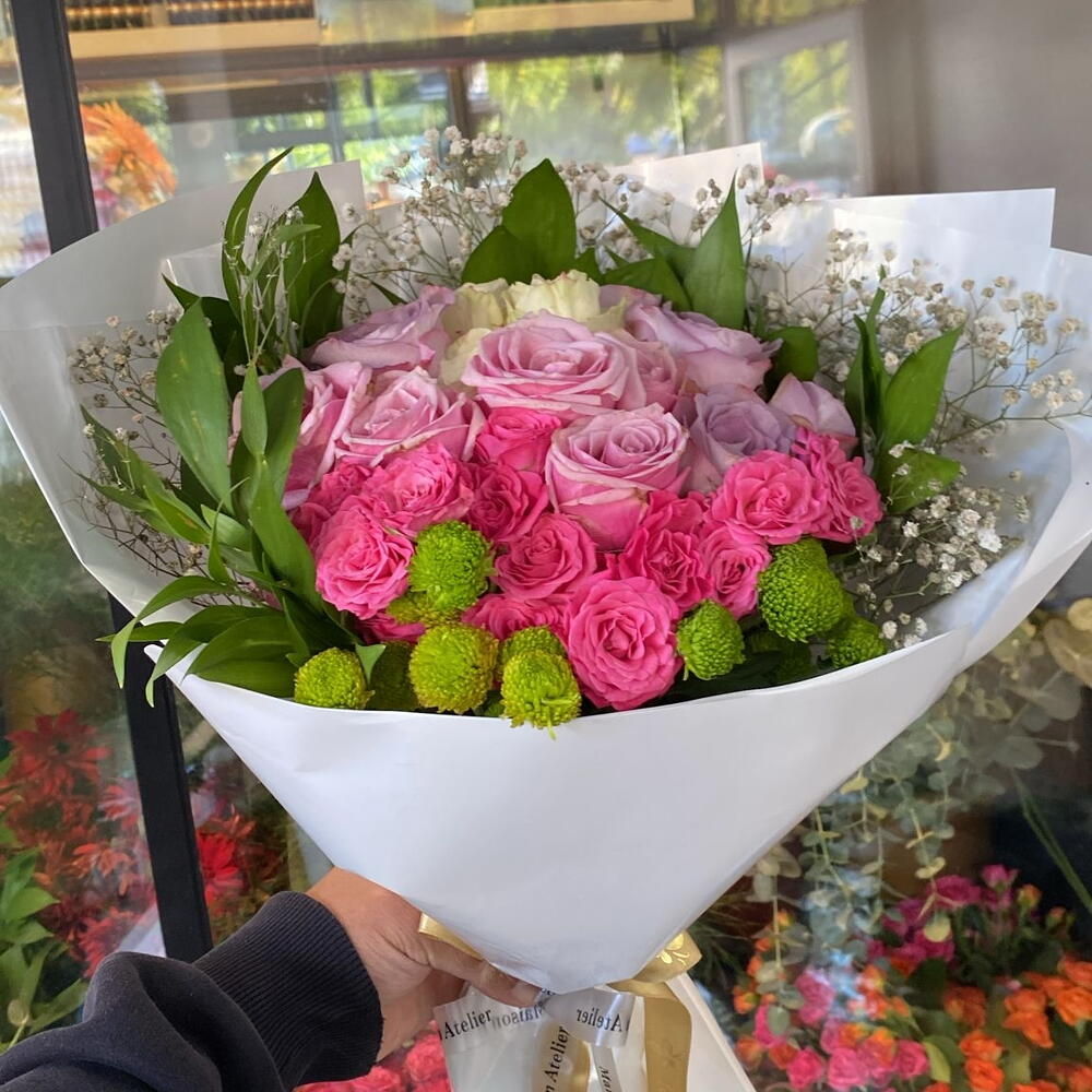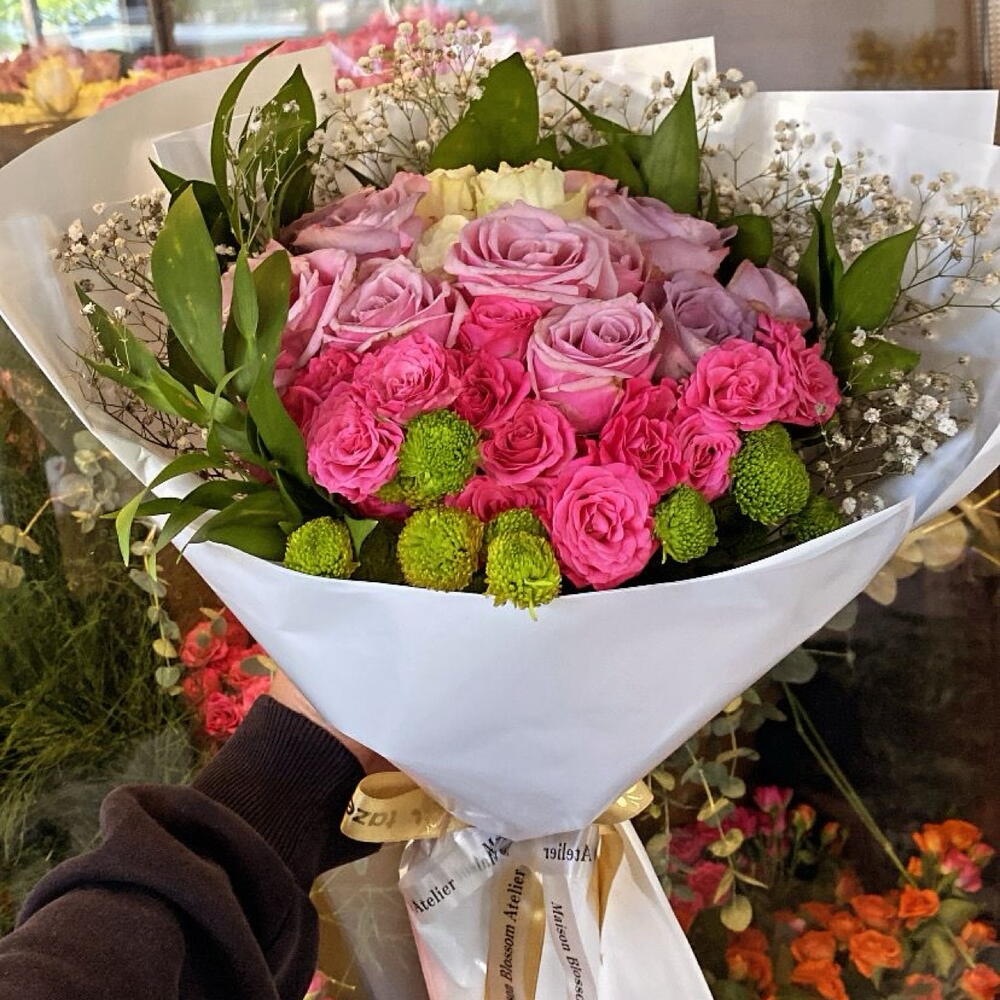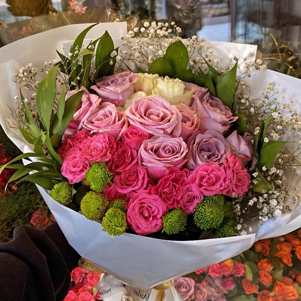 Zarif ve şık tasarımıyla dikkat çeken bu özel buket, sevdiklerinize unutulmaz bir hediye olacak. 🌸 • Pembe güllerin romantik tonu, saf sevgi ve zarafeti temsil eder. • Lila güller huzuru ve asaletin simgesidir. • Yeşil şantinikler bukete canlılık ve tazelik katar. • Beyaz cipso çiçekleri ise sadelik ve masumiyetin ince dokunuşunu yansıtır. Modern beyaz ambalajı ve şık kurdele detayıyla hazırlanmış bu buket, doğum günü, yıldönümü, özel kutlamalar ya da içten bir teşekkür için mükemmel bir seçimdir. 💐 Sevginizi en zarif haliyle ifade edin! ❤️