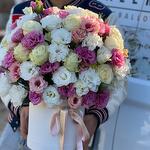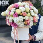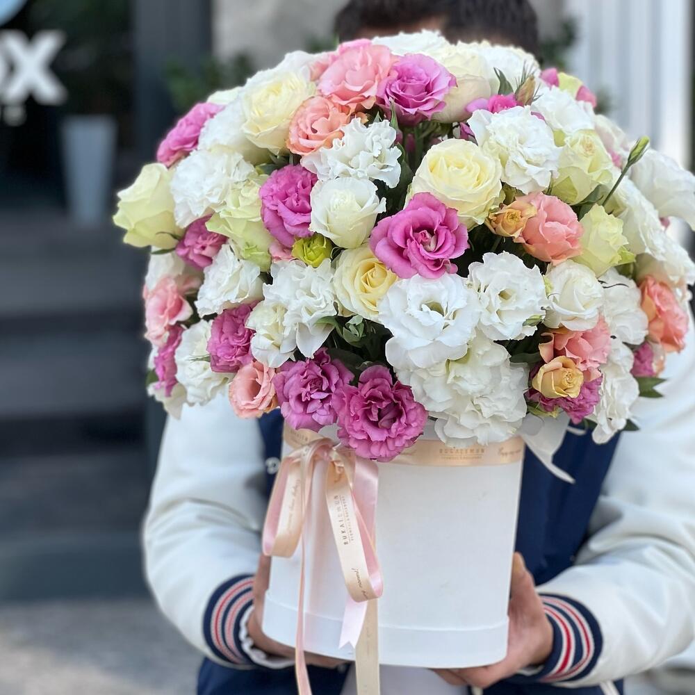 Pembe beyaz eustomalarla hazırlanan kutu arada beyaz ve pembe güller eşlik ediyor. Kutunun formu rahat ve çiçekler birbirini sıkıştırmıyor