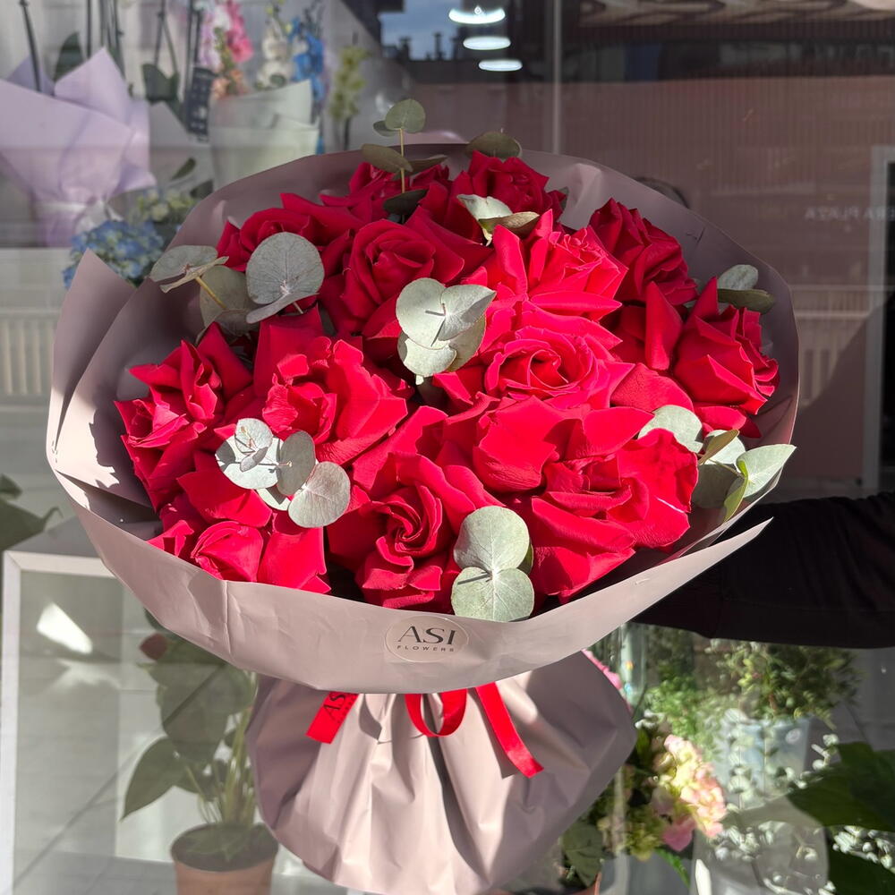 Bu zarif çiçek buketi, iki adet Fransız gülü ve onüç adet ferahlatıcı efkalipt dallarıyla özenle hazırlanmıştır. Dikkat çekici ve sofistike bir görünüm sunan bu buket, hem modern hem de klasik dekorasyonlarla mükemmel şekilde uyum sağlar. İki çeşit çiçeğin birleşiminden doğan bu ahenk, her türlü özel gününüzde sevdiklerinize farklılık ve zarafet katacak. Çiçekler taptaze ve dayanıklıdır, uzun süre boyunca güzelliklerini korurlar. Bu çiçek buketi, güzelliği ve kalitesiyle baş döndürücü bir etki yaratıyor.