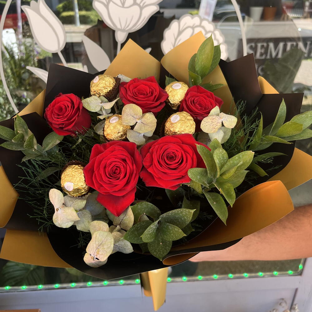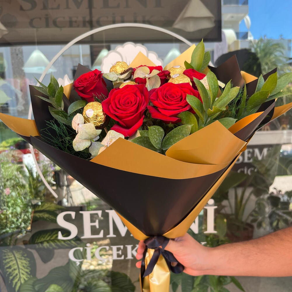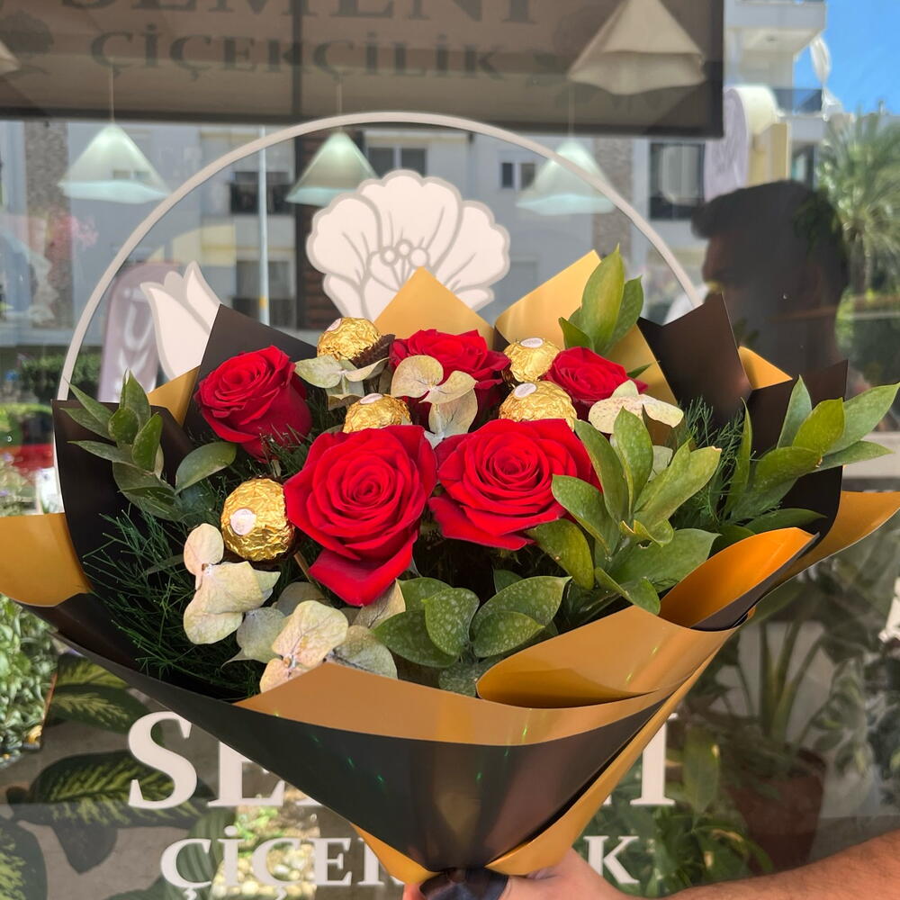 Our handcrafted bouquet features luscious red roses paired with the irresistible charm of Ferrero Rocher chocolates — all beautifully wrapped in a sophisticated combination of black and gold. 💝 Perfect for anniversaries, birthdays, romantic surprises, or simply to make someone’s day unforgettable. 📍 Available now at SEMENİ Çiçekçilik – Antalya