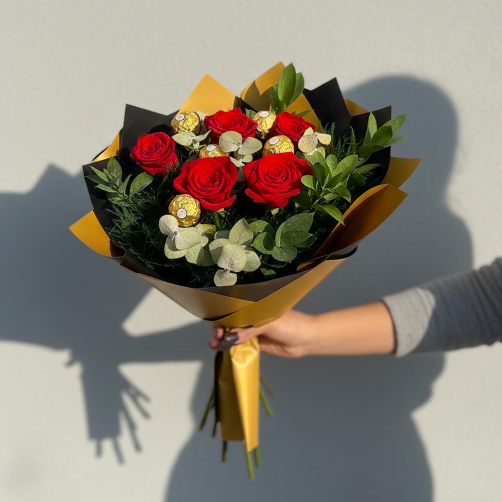 Ruscus - 5 adet kırmızı gül - 5 adet rocher ferroro - 5 adet okiliptus - 5 adet kıl yeşillik - 5 adet altın buket kâğıdı - 4 adet